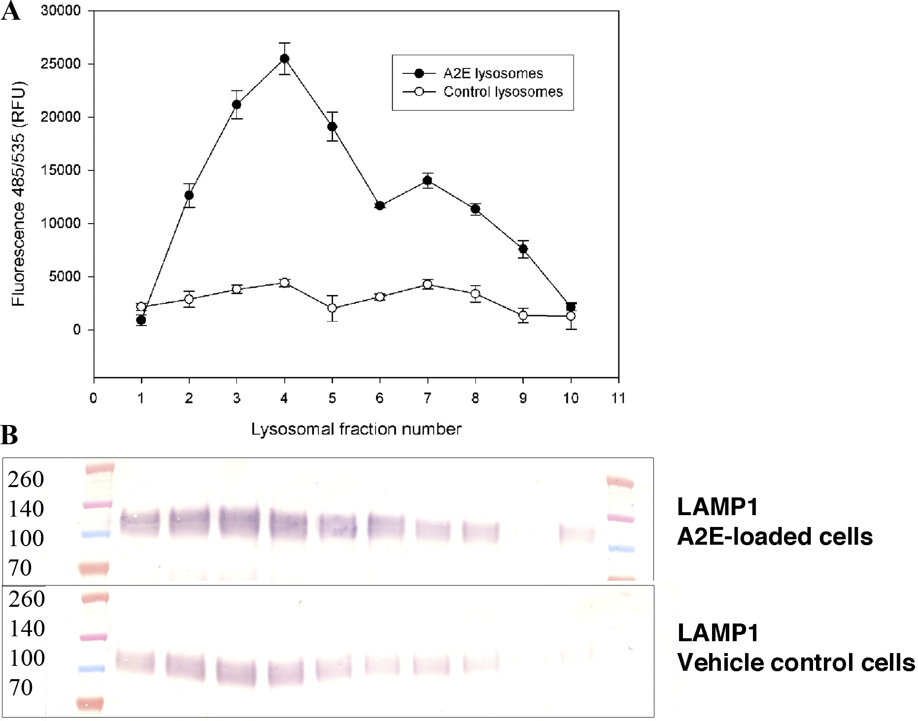 A: A2E fluorescence (ex 485/ em 535) was measured in lysosomal fractions prepared with gradient ultracentrifugation. B: Lysosomal-associated membrane protein 1 (LAMP1) lysosomal marker expression in immunoblots of the same fractions was probed