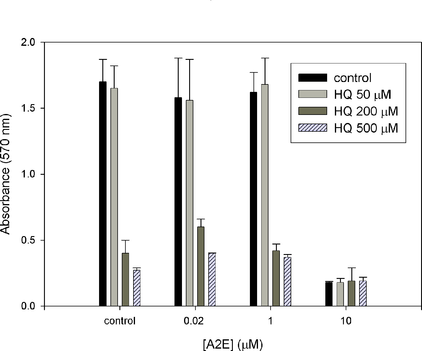 Figure 4. Sensitivity of ARPE-19 cells to hydroquinone oxidative stress in the presence of various concentrations of A2E. The viability