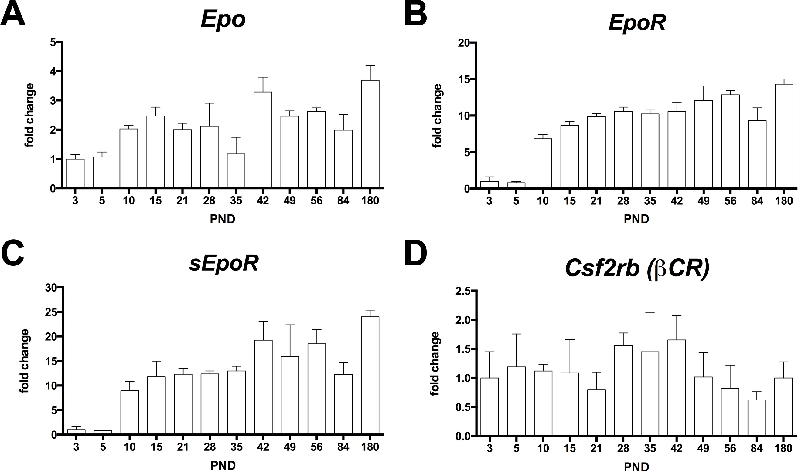 Figure 1. Gene expression profile in the retinas of wild-type mice. Relative expression of erythropoietin (Epo; A), erythropoietin receptor (EpoR; B), soluble erythropoietin receptor (sEpoR; C), and beta common receptor (Csf2rb (βCR); D) as measured with semiquantitative real-time PCR on cDNA samples prepared from the total retinas of the C57BL/6 mice at the