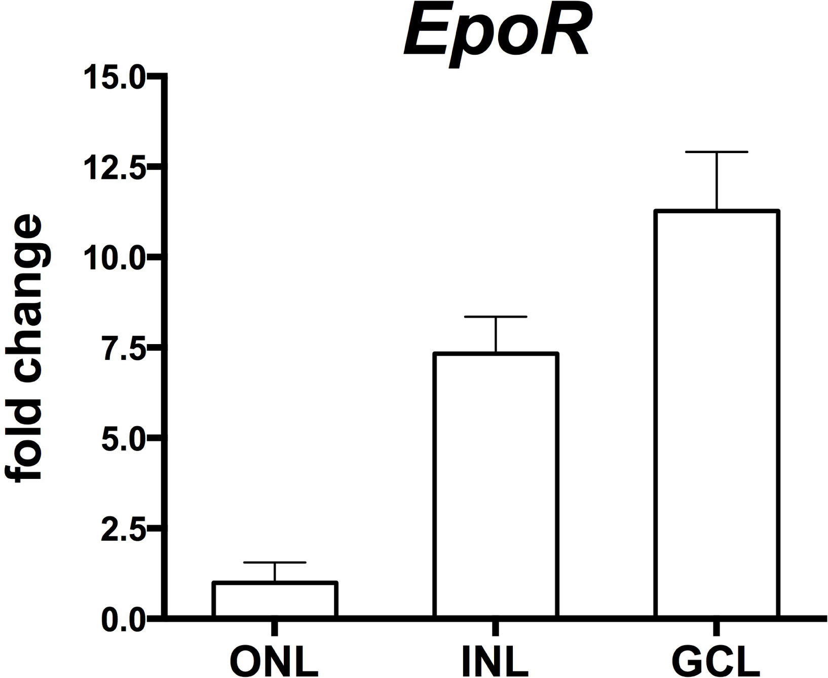 Figure 2. Expression of EpoR in the retinal nuclear layers. Semiquantitative real-time PCR after laser capture microdissection showed relative EpoR mRNA levels in the different retinal layers (as indicated) of the EpoRflox/flox control mice. Values were normalized to actin beta (Actb) and expressed relative to the value in the ONL, which was set to 1. Shown are the mean ± standard deviation (SD) of at least