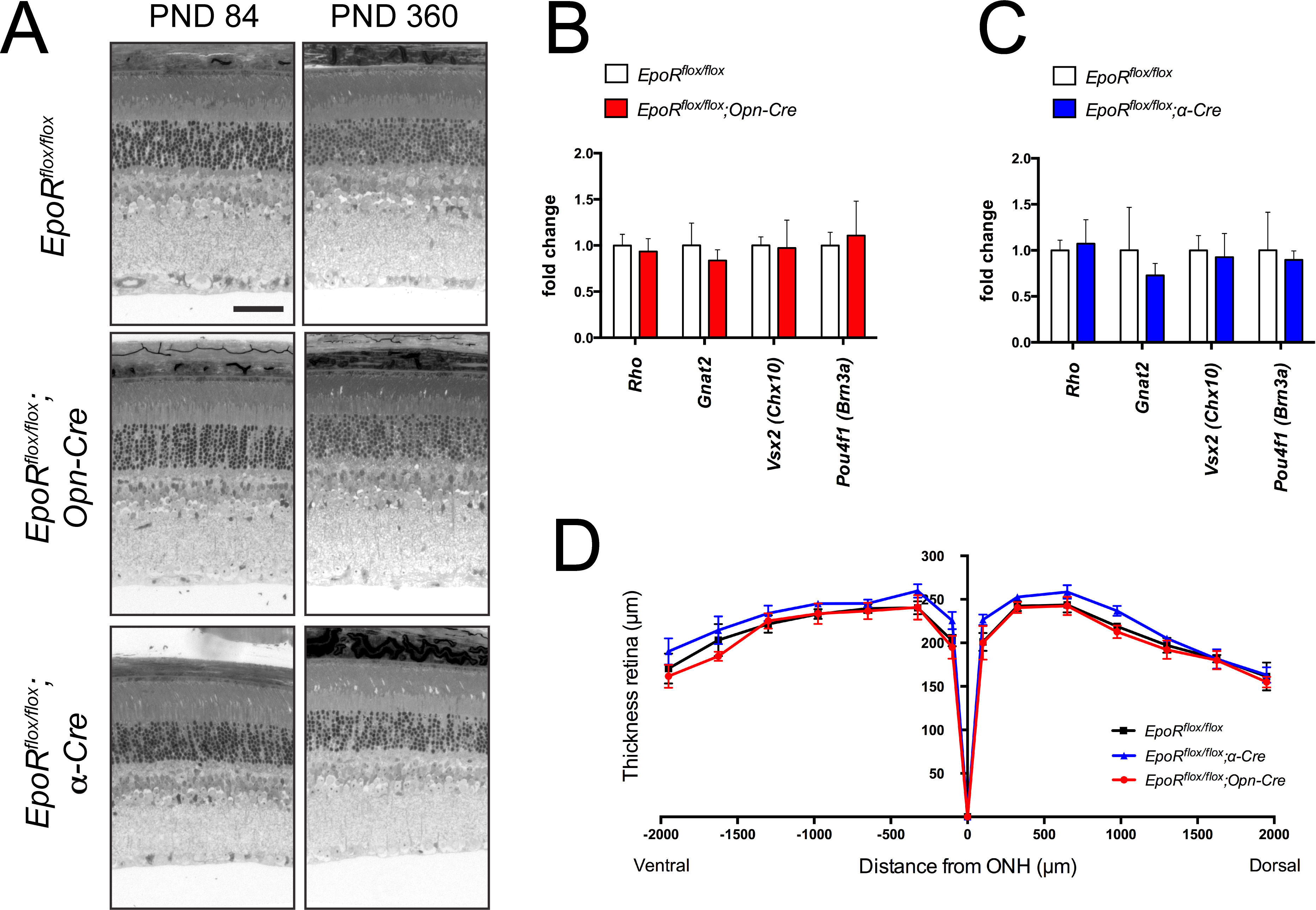 Figure 4. Retinal morphology of EpoR knockdown mice. A: Retinal morphology of the EpoRflox/flox, EpoRflox/flox;Opn-Cre and EpoRflox/flox;α-Cre mice at P84 and P360. Shown are representative sections of the central retina (EpoRflox/flox and EpoRflox/flox;Opn-Cre) and the peripheral retina (EpoRflox/flox;α-Cre) of at least three animals per time point. Scale bar: 50 µm. B, C: Relative expression levels of rhodopsin (Rho), guanine nucleotide binding protein alpha transducin 2 (Gnat2), visual system homeobox 2 (Vsx2 (Chx10)), and POU domain, class 4 transcription factor 1 (Pou4f1 (Brn3a)) mRNAs as determined with semiquantitative real-time PCR in the total retinas of the EpoRflox/flox;Opn-Cre (B, red bars), EpoRflox/flox;α-Cre (C, blue bars), and EpoRflox/flox control littermates (B, C, white bars) at 7.5 months of age. Given are the mean ± standard deviation (SD) of n = 4 retinas. Values were normalized