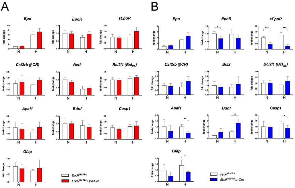 Figure 7. Expression of selected genes in the retinas of EpoR knockdown mice. A, B: Relative quantification of erythropoietin (Epo), erythropoietin receptor (EpoR), soluble erythropoietin receptor (sEpoR), beta common receptor (Csf2rb (βCR)), B cell lymphoma 2 (Bcl2), Bcl2-like 1 (Bcl2l1(BclXL)), apoptotic protease activating factor 1 (Apaf1), brain-derived neurotrophic factor (Bdnf), caspase 1 (Casp1), and glial fibrillary acidic protein (Gfap) gene expression in the retinas of the EpoRflox/flox;Opn-Cre (A) and the EpoRflox/flox;α-Cre mice (B) compared to EpoRflox/flox control littermates with real-time PCR. cDNAs were prepared from total retinal RNA isolated at P84. Animals were kept under