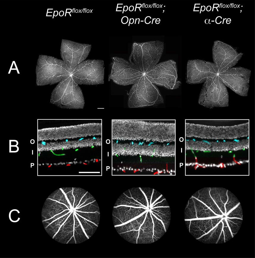 Scale bar: 100 µm. C: Fluorescein angiography of the EpoRflox/flox, EpoRflox/flox;Opn-Cre, and EpoRflox/flox;α-Cre mouse retinas at P84 performed with Micron III imaging. Shown are representative images of three animals per genotype.