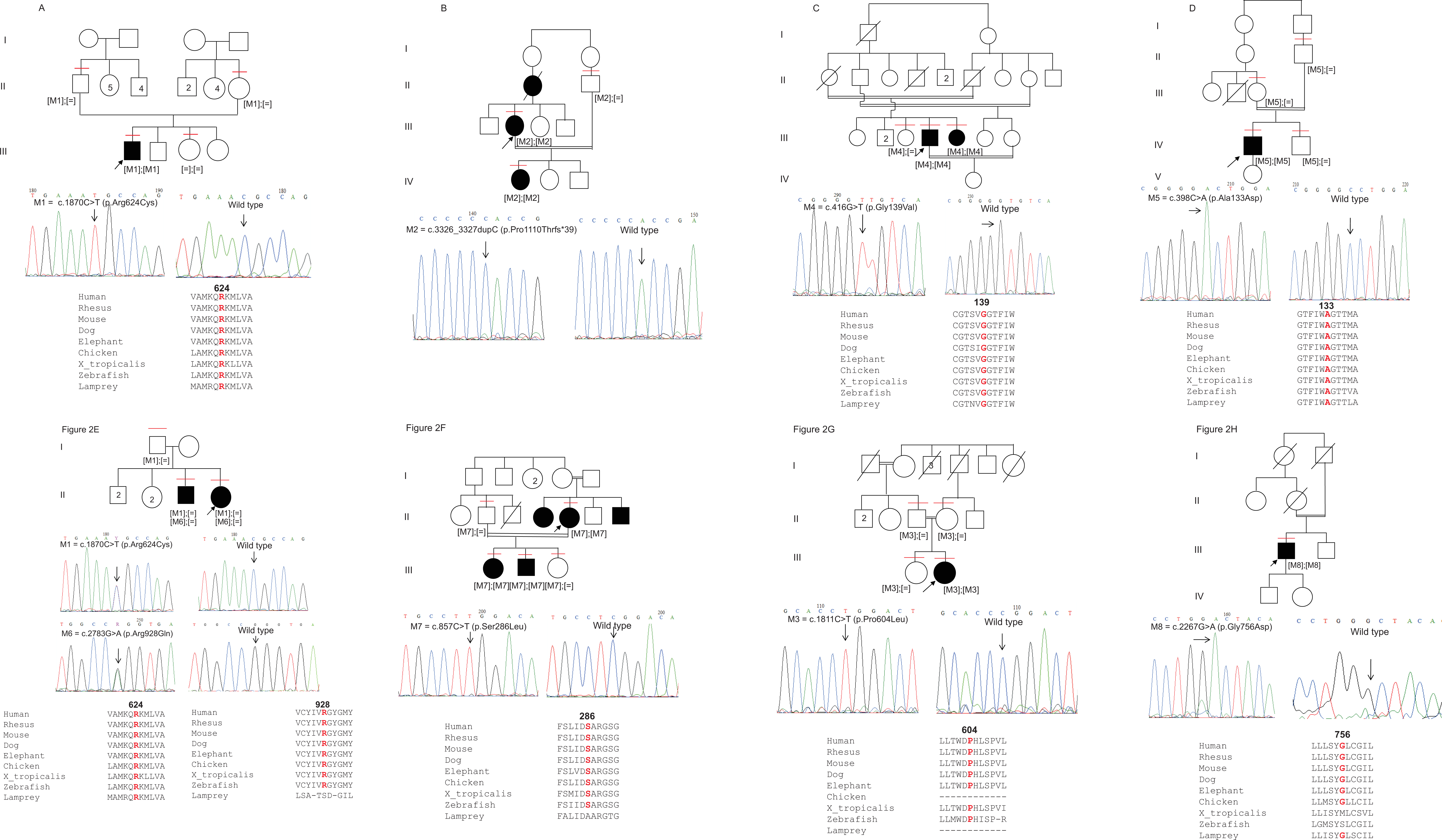 Figure 2. Pedigree, sequence chromatogram traces and conserved amino acid residues of the eight cCSNB families. The squares and the