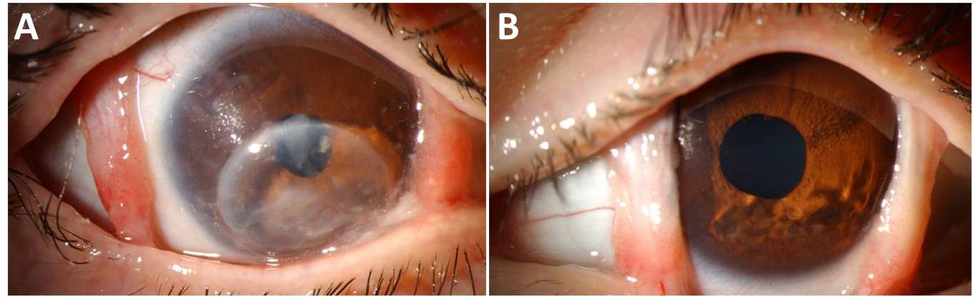 Figure 3. Slit lamp biomicroscopy. A: Right eye slit lamp photo. Note the medial and lateral tarsal pillars, inferiorly decentered corneal graft, and posterior