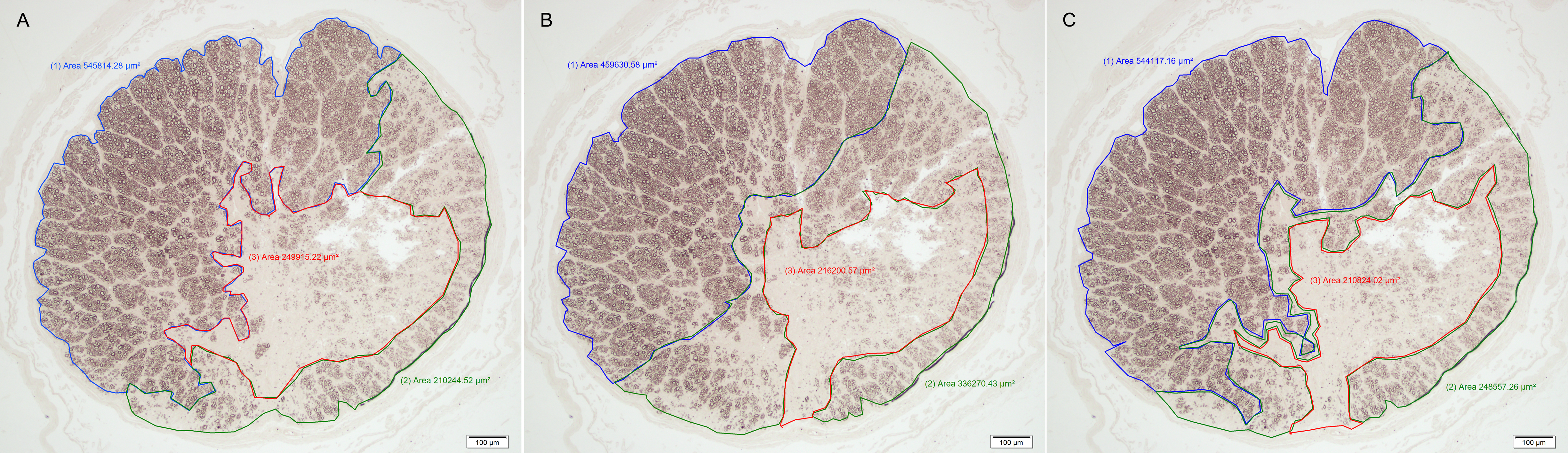 region. Note the variation of the selected areas by the different raters and the final area of each region in μm2. The scale bar = 100 μm.