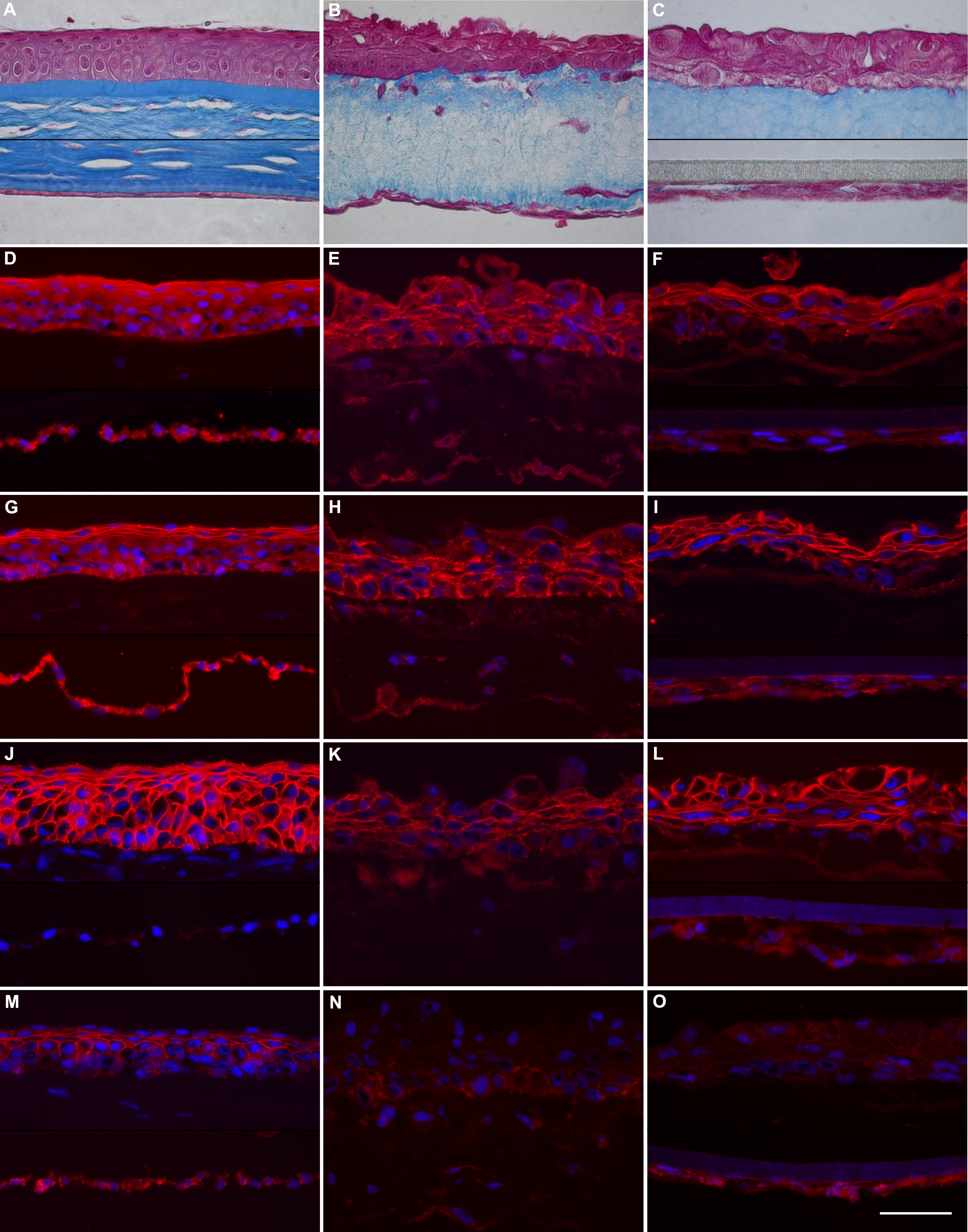 seeded under the collagen gel (B, E, H, K and N) or bovine endothelium growing on a synthetic membrane (C, F, I, L and O). As shown on the paraffin sections, stained with Masson’s trichrome (A–C), cells are stained pink, and the collagen tissue is blue. Immunofluorescent images of cryosections (D–O) have been exposed to the antibodies against the following antigens: α-catenin (D–F), β-catenin (G–I), E-cadherin (J–L), and N-cadherin (M–O). Cell nuclei were stained blue with Hoechst dye (D–R). Scale bar = 50 µm.