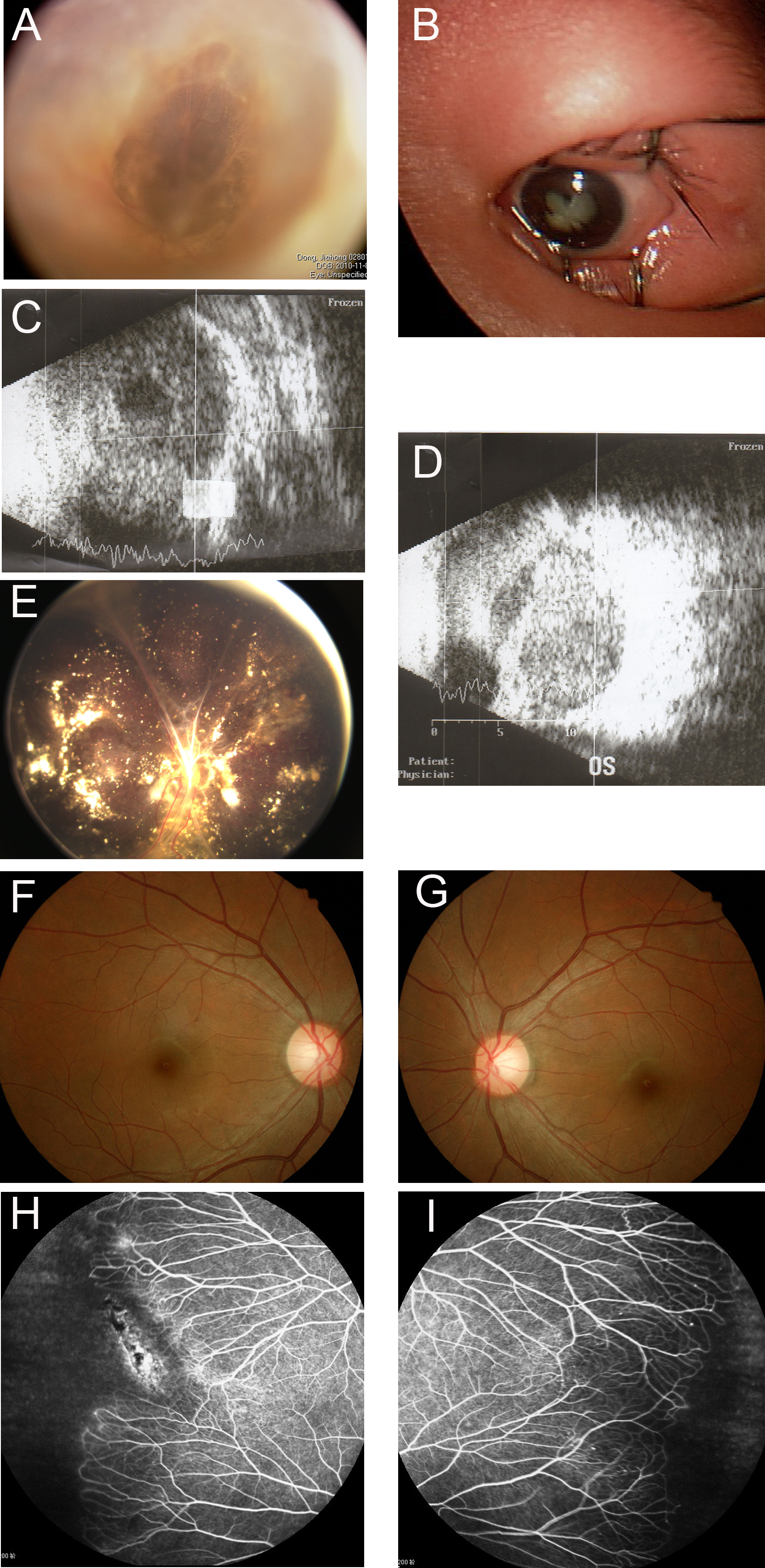 eye is more severely affected than the right eye. Posterior synechia is evident in the left eye. E: Fundus of Patient 2’s right eye at the last follow-up after lensectomy and vitrectomy. The retina was mostly attached. F-I: Fundus photos and fundus fluorescein angiography (FFA) of the asymptomatic mother with c.1619T>C in Family 2. F and G: Fundus photos show normal posterior fundi. H and I: FFA shows that the mother has peripheral nonperfusion areas, increased ramification, and shunts of the peripheral retinal
