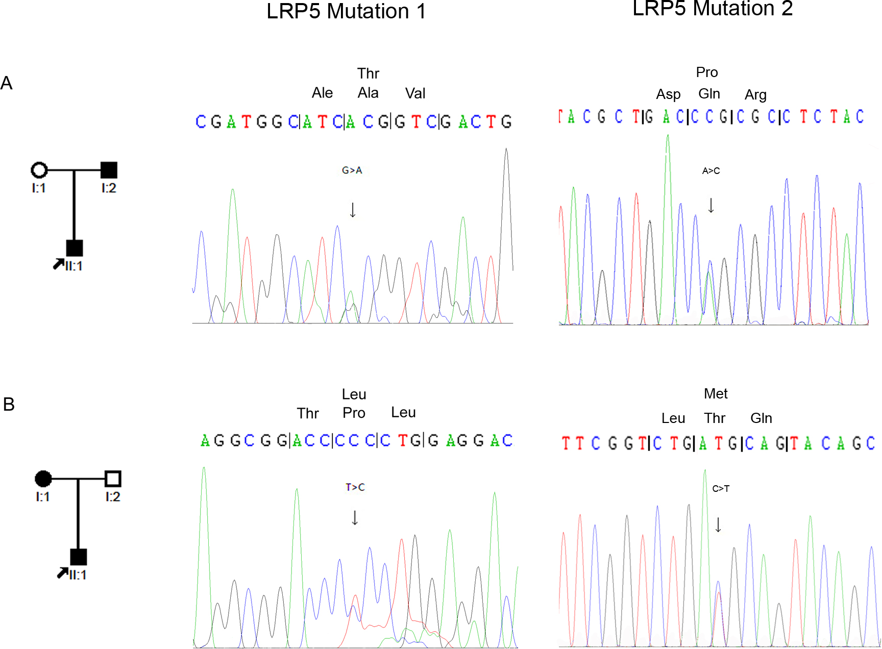 LRP5. A: In Family 1, Patient 1 had two LRP5 mutations, c.1264G>A (p.A422T) from the affected father and c.2447A>C (p.Q816P) from unaffected mother. B: In Family 2, Patient 2 also had two LRP5 mutations; c.1619T>C (p.L540P) was from the affected mother, but c.2555C>T (p.T852M) was not detected in either parent. The