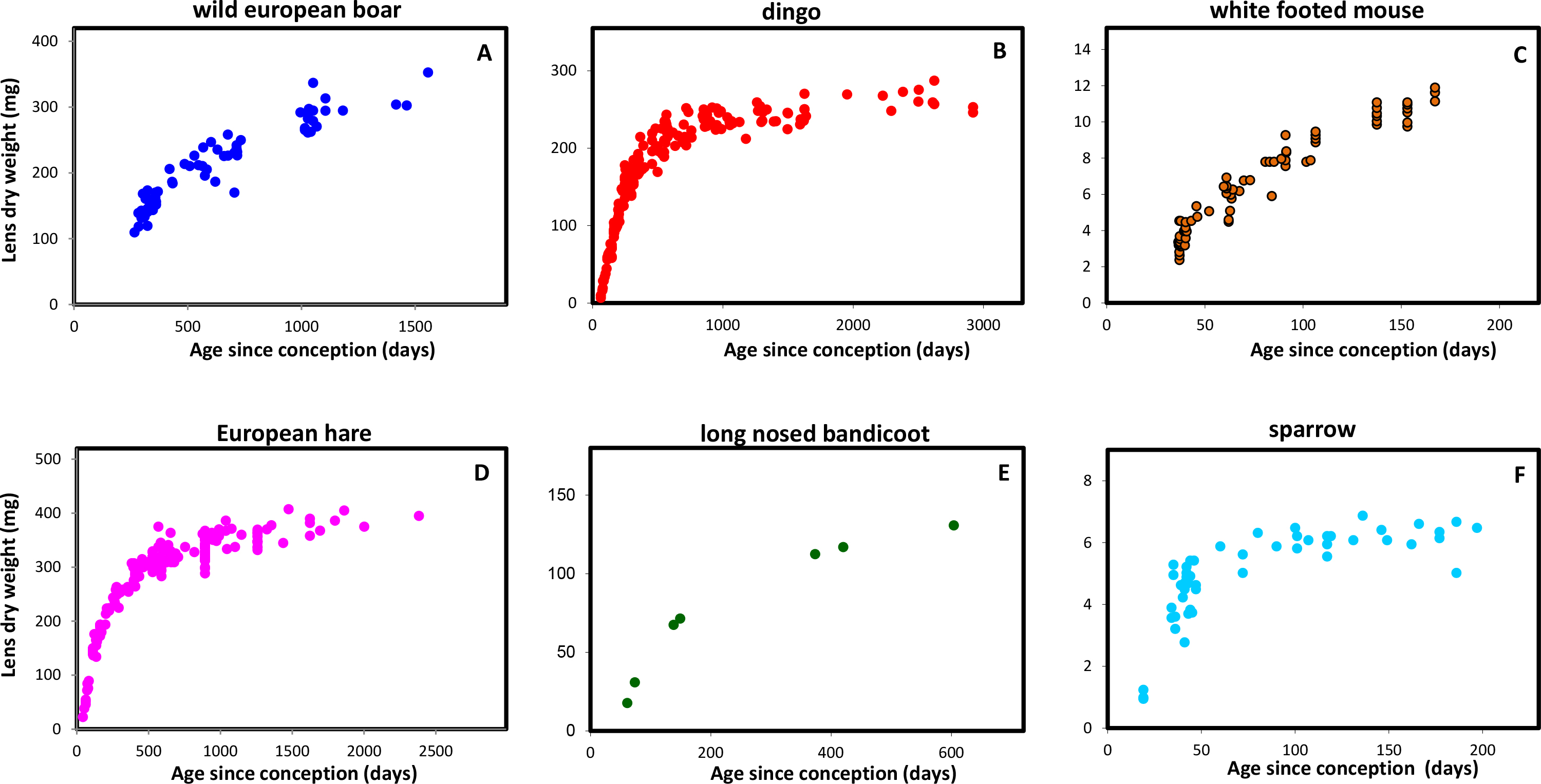 Figure 2. Changes in lens dry weight as a function of age. Weights are shown for (A) wild boar (113 lenses or data), (B) dingoes (185), (C) white-footed field mice (69), (D) European hares (88), (E) long-nosed bandicoots (7), and (F) sparrows (50). Data sources are as indicated in Appendix 1.