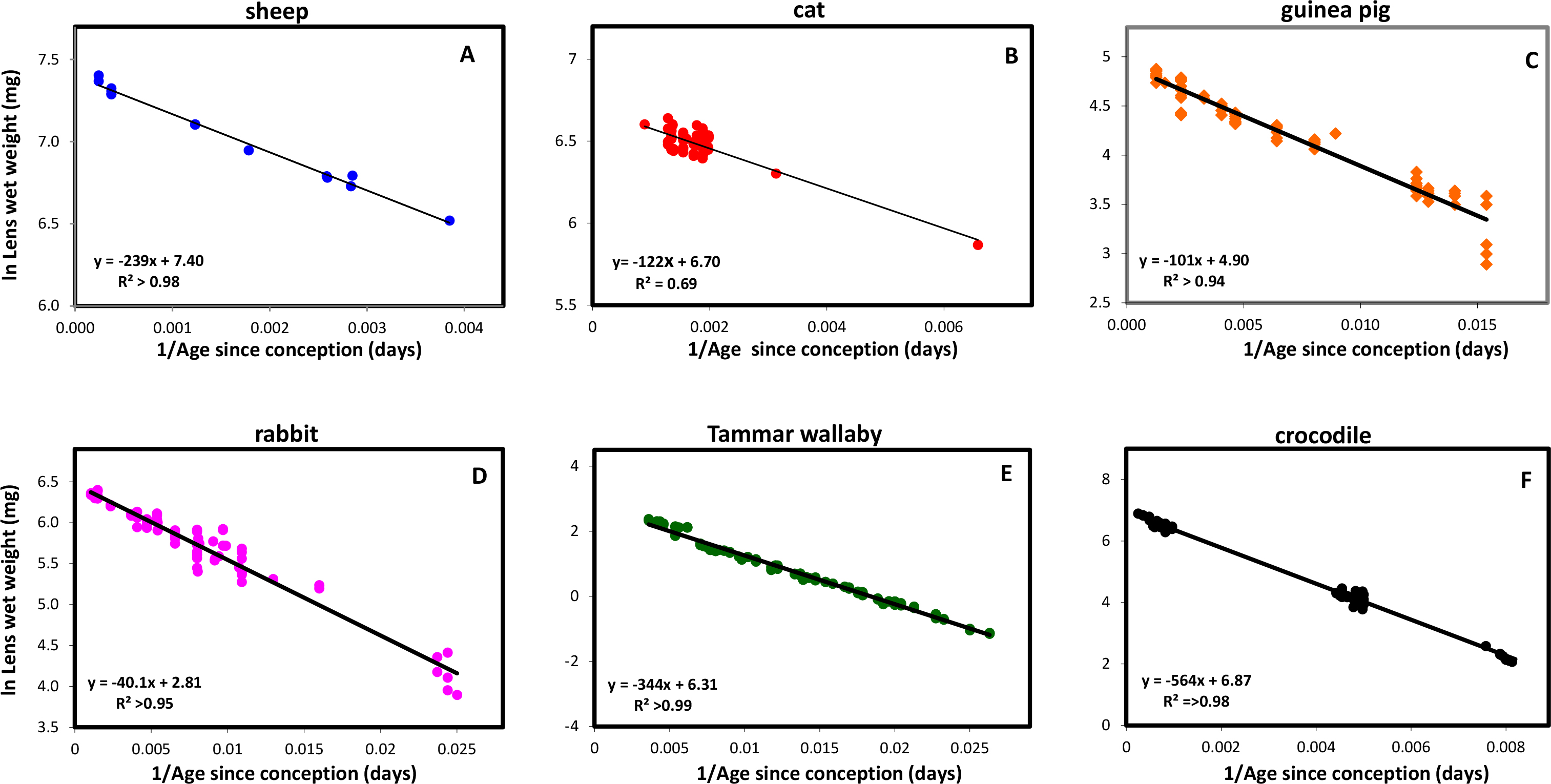 Figure 3. Logistic analysis of the changes in lens wet weight as a function of age. Data shown are for the species shown in