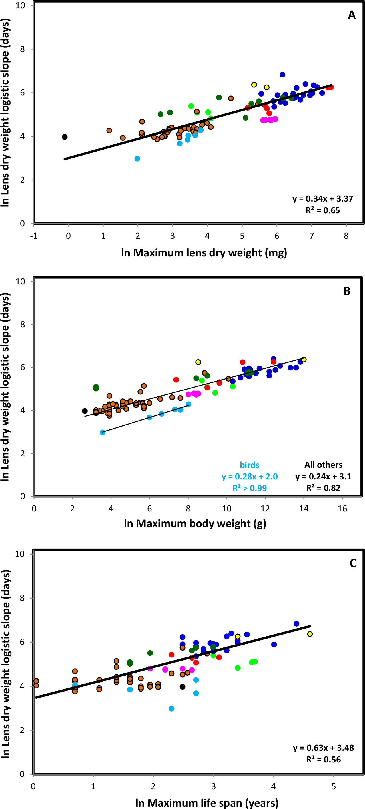 lens dry weight (A), maximum possible life span (B), normal maximum bodyweight (C), and gestational period (D) in warm-blooded species. Data for the species that appear to exhibit biphasic growth have been omitted. Data for related
