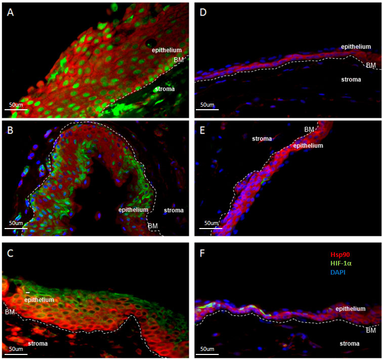 Figure 10. Distribution of HIF-1α (green) and Hsp90 (red) as determined by double immunofluorescence staining in pterygia (Α-C) and normal conjunctiva samples (D-F). Nuclei are DAPI labeled in blue. A: Co-localization of HIF-1α nuclear expression with Hsp90 cytoplasmic expression in cells of the entire epithelium. B: Hsp90 is absent from focally distributed cells with cytoplasmic HIF-1α immunoreactivity. C: Cytoplasmic staining of HIF-1α is demonstrated in superficial layers of epithelium whereas Hsp90 staining is limited to