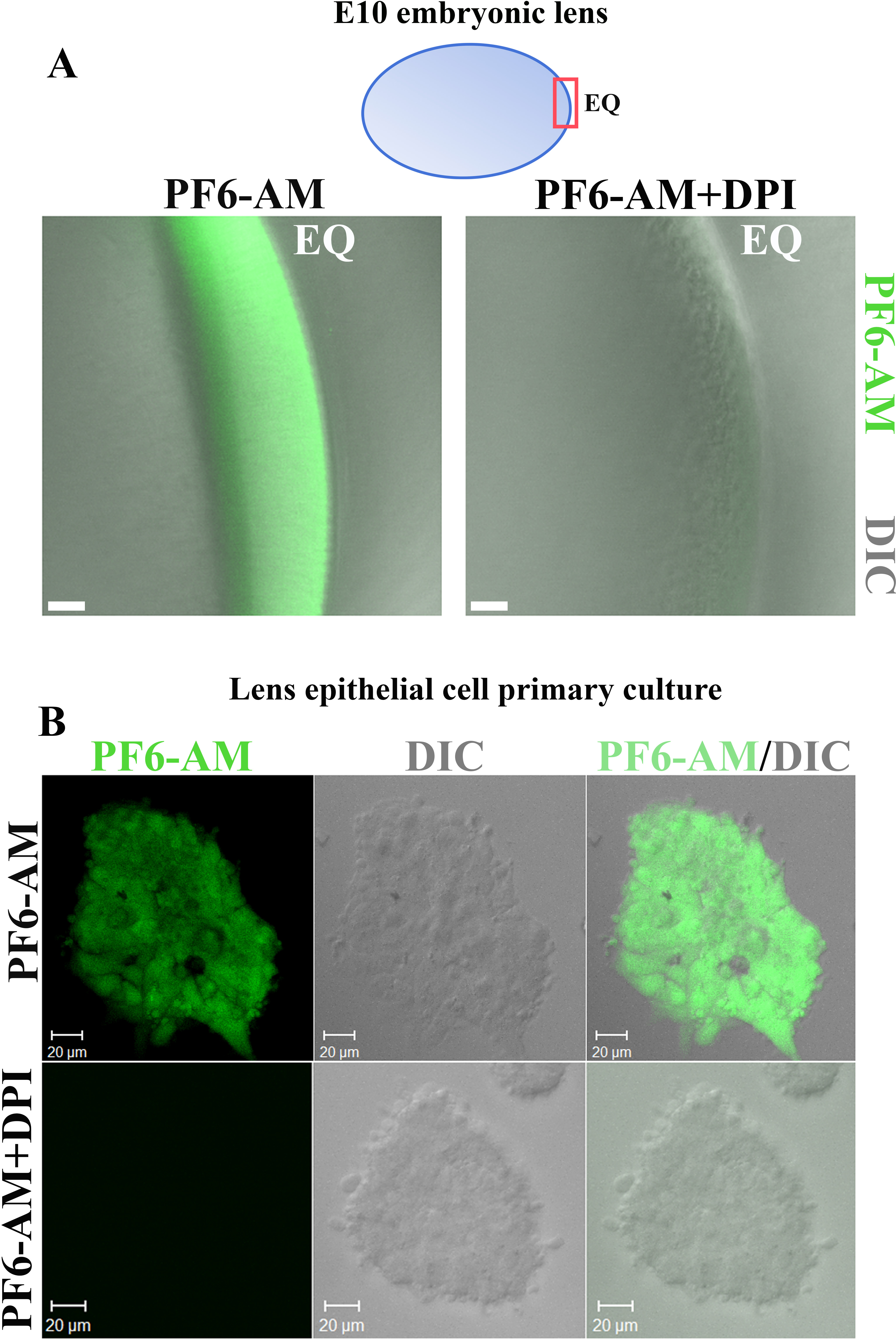(DPI) attenuates PF6-AM fluorescence, suggesting the presence of an endogenous H2O2 signal. Both images are shown as an overlay with the differential interference contrast (DIC) image. B: Primary cultures of lens epithelial cells. (Top panels) Cultured lens epithelial cells incubated with PF6-AM (green, left