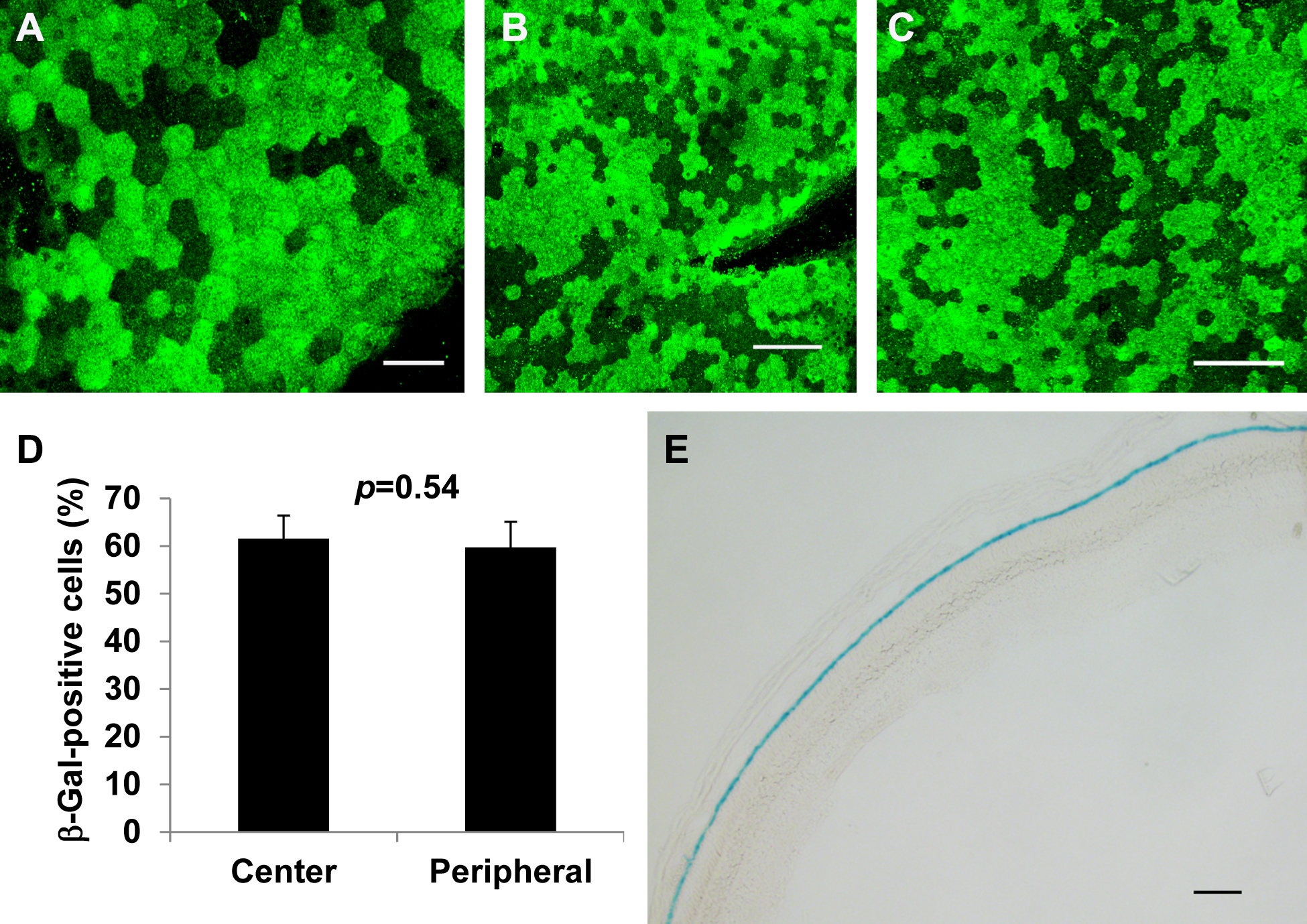 in F1 mice derived from inducible RPE-specific Cre and ROSA26 lacZ reporter mice. A–D: Representative images and statistical analysis of immunostained RPE flatmounts for Cre-activated β-gal (green). A: An enlarged confocal image shows the number and frequency of β-gal-expressing RPE cells. Scale bar = 40 µm. B–C: Representative images show the number and frequency of β-gal-positive cells in central (B) and peripheral RPE flatmounts (C). Scale bars = 100 nm. D: Statistical analysis with the Student t test shows that there was no significant difference in the frequency of β-gal-positive RPE cells between the central and