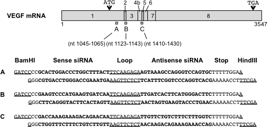 Figure 1. Schematic diagram showing the binding locations within human VEGF mRNA of the three siRNAs tested and the siRNA sequences.