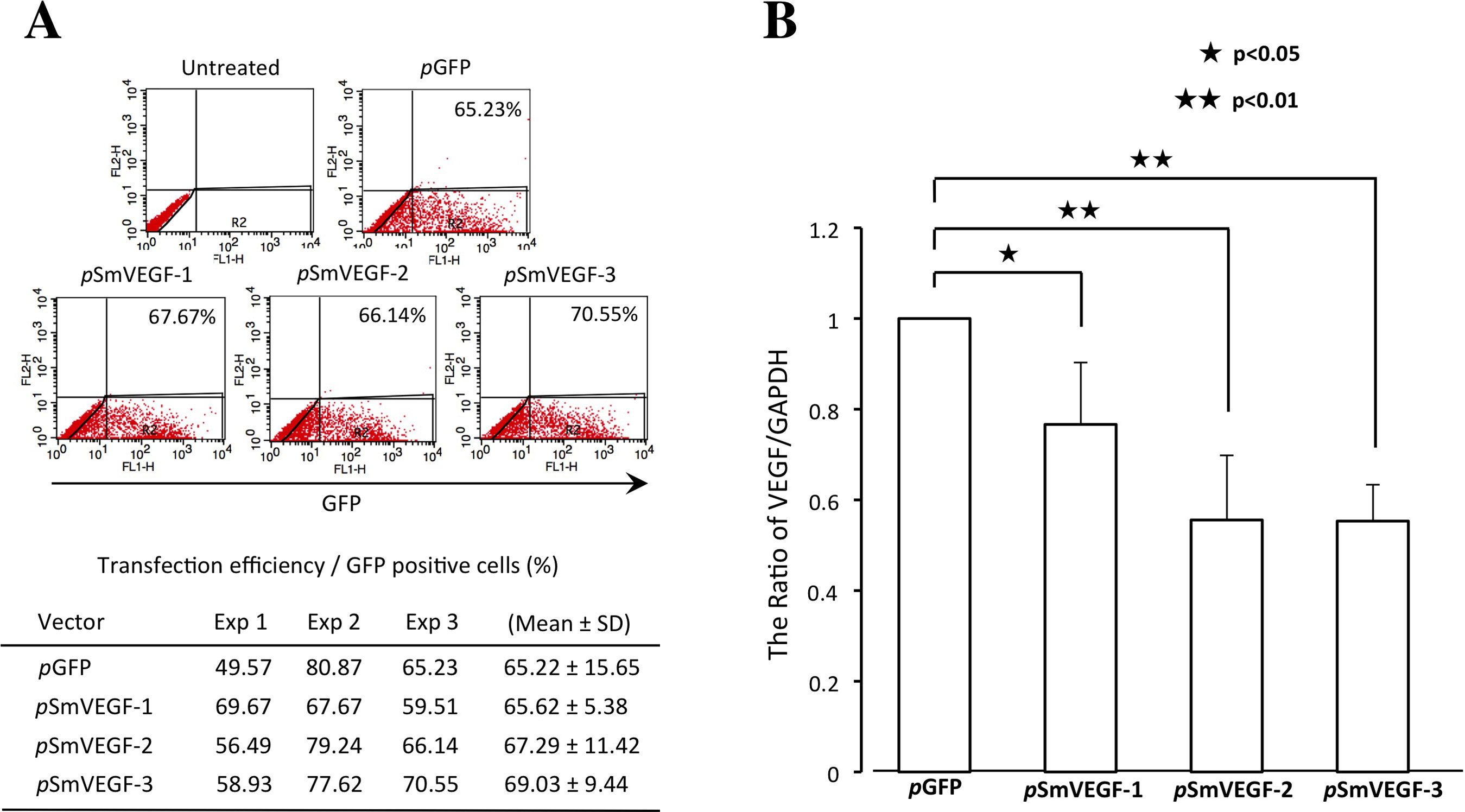 smaller in cells transfected with the indicated SmVEGFs than the control vector. (pSmVEGF-1, pSmVEGF-2, pSmVEGF-3:0.77, 0.55, 0.55).