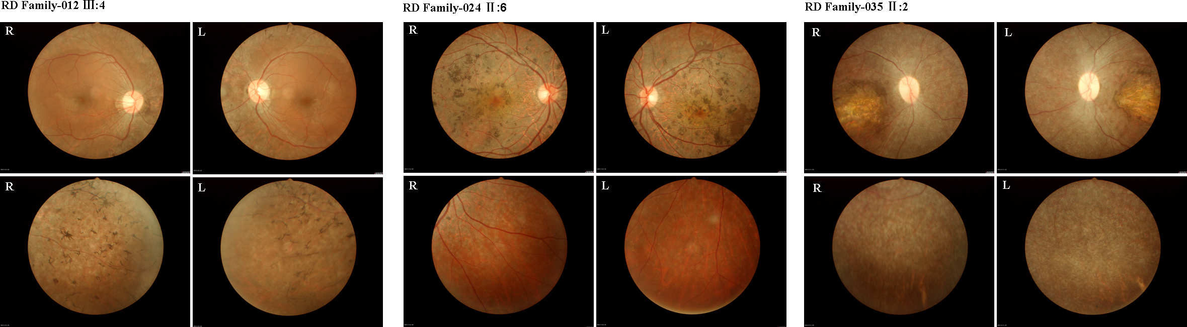 Figure 2. Bilateral fundus photography of the probands from the respective families with retinal dystrophies. Bilateral fundus photography