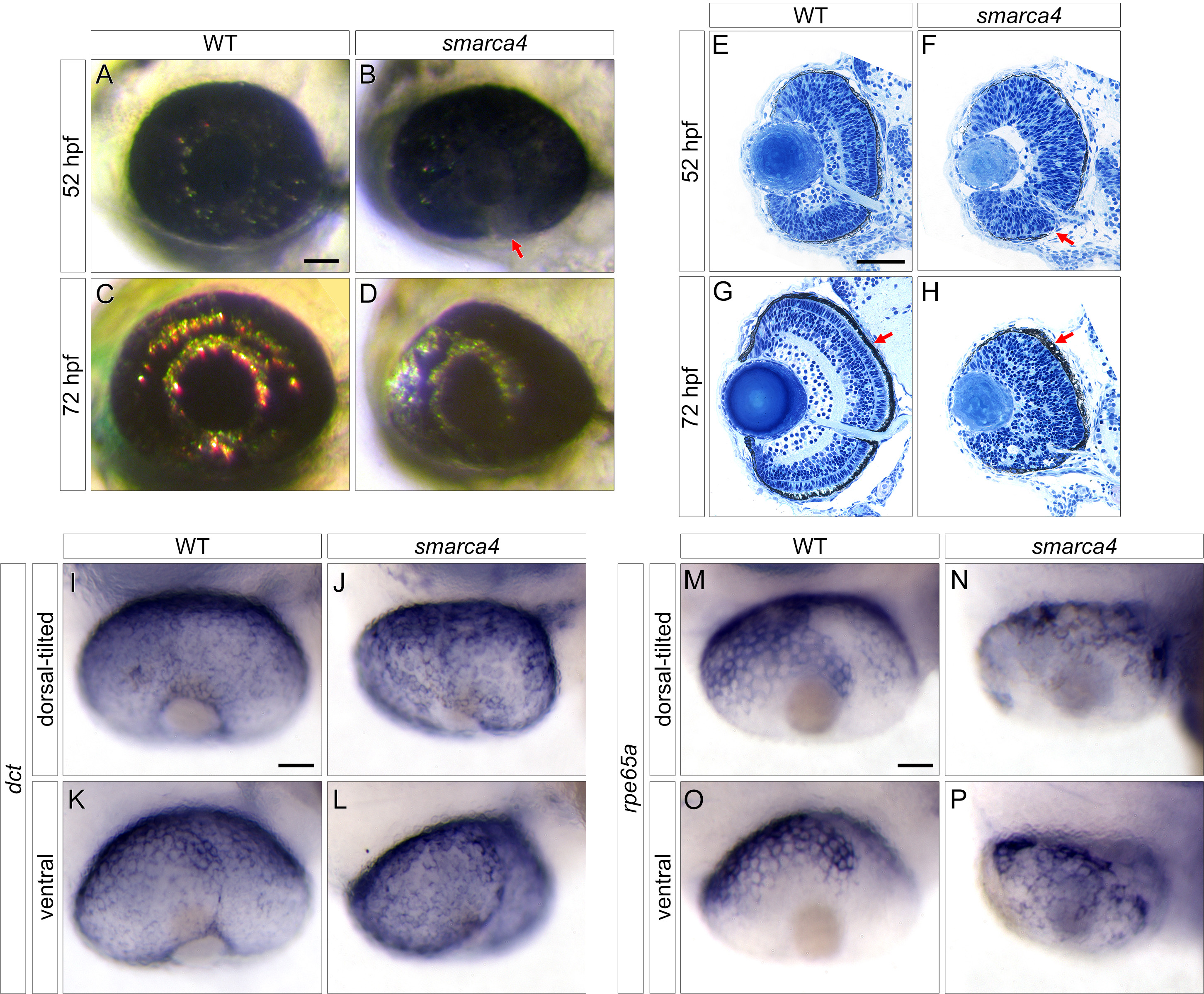 up. The red arrow in B indicates a ventral region of smarca4 where the retinal pigment epithelium (RPE) pigmentation level was lower than the other regions. E–H: Transverse histological sections of the WT and smarca4 eyes at 52 and 72 hpf are shown. One distinctive hallmark of smarca4 is the disruption of their retinal lamination. In addition, the smarca4 RPE appears paler (B and E, red arrow) and dysmorphic (H, red arrow) compared with the WT. In these sections, lateral is to the left, and dorsal is up. The RPE differentiation problem