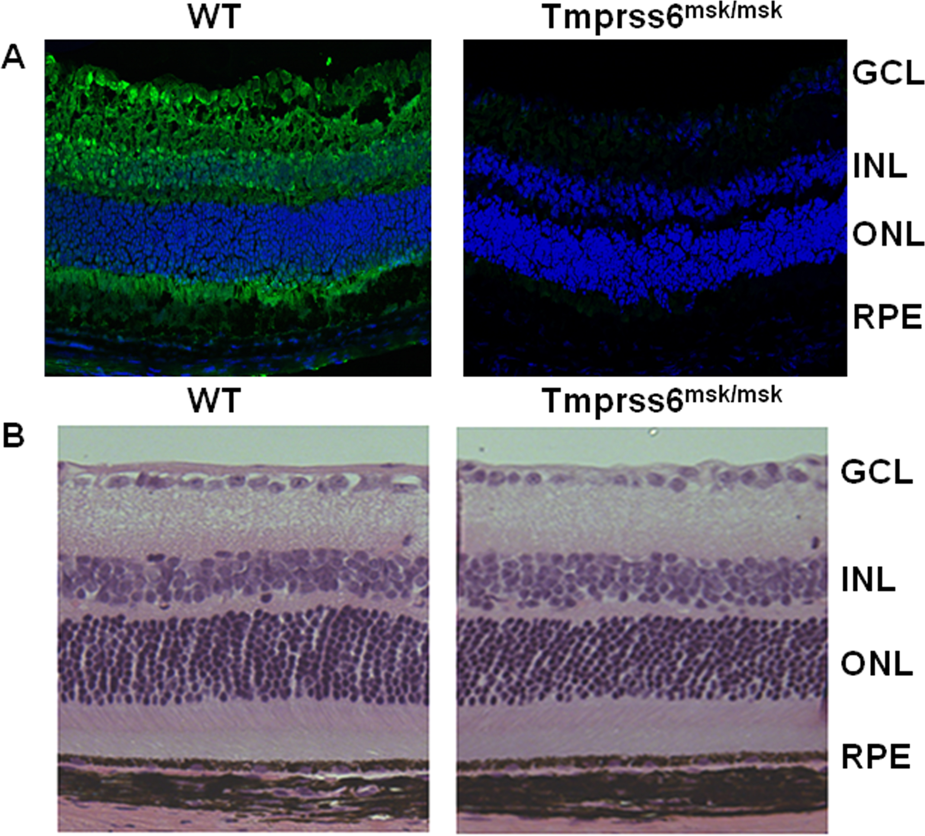 Figure 2. Specificity of matriptase-2 staining in retina and retinal morphology in wild-type and Tmprss6msk/msk mice. A: The expression pattern of matriptase-2 was analyzed in retinal sections prepared from wild-type mice and Tmprss6msk/msk mice using an antibody specific for the C-terminal tail of the matriptase-2 protein. The Tmprss6msk/msk mouse expresses a truncated matriptase-2 that lacks the C-terminal tail. The experiment was repeated twice with retinal sections