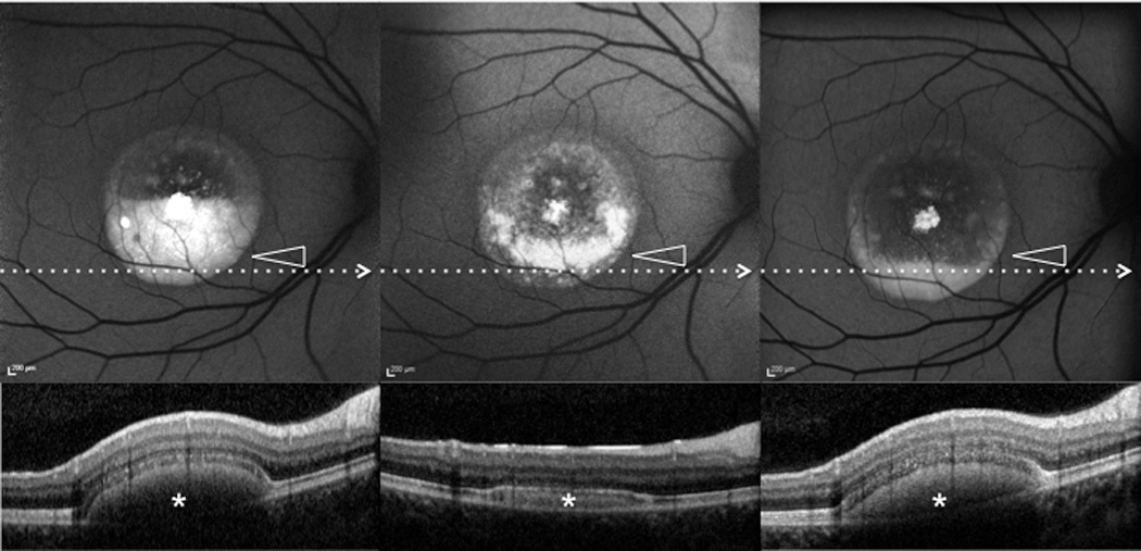 material (asterisk) and replacement by a fluid component. During follow-up, blue FAF frames and SD-OCT scans (top middle and