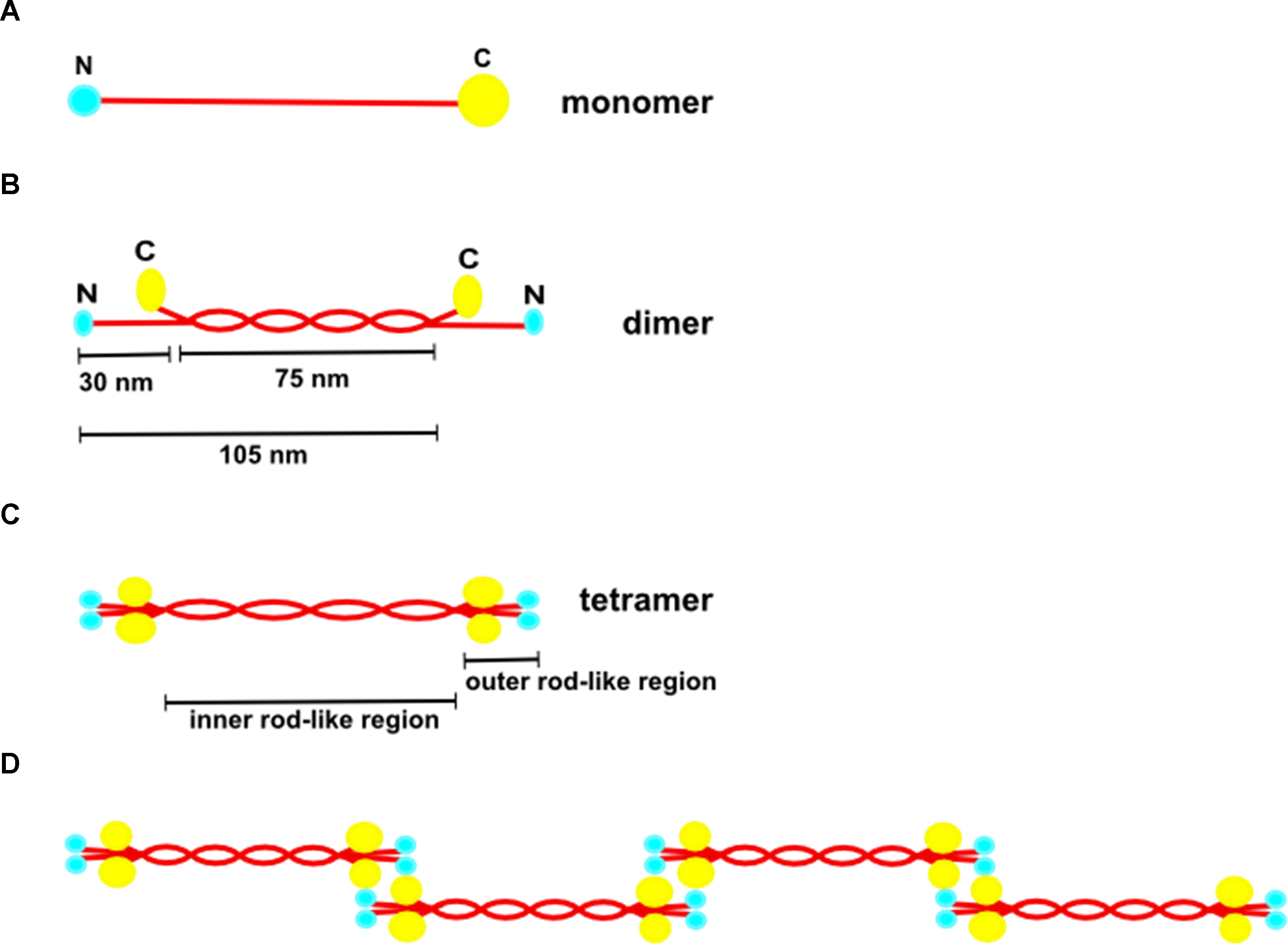 (B). Pairs of dimers associate laterally to form tetramers (C). Tetramers can be described as possessing an inner rod-like region and two outer rod-like regions separated by and ending