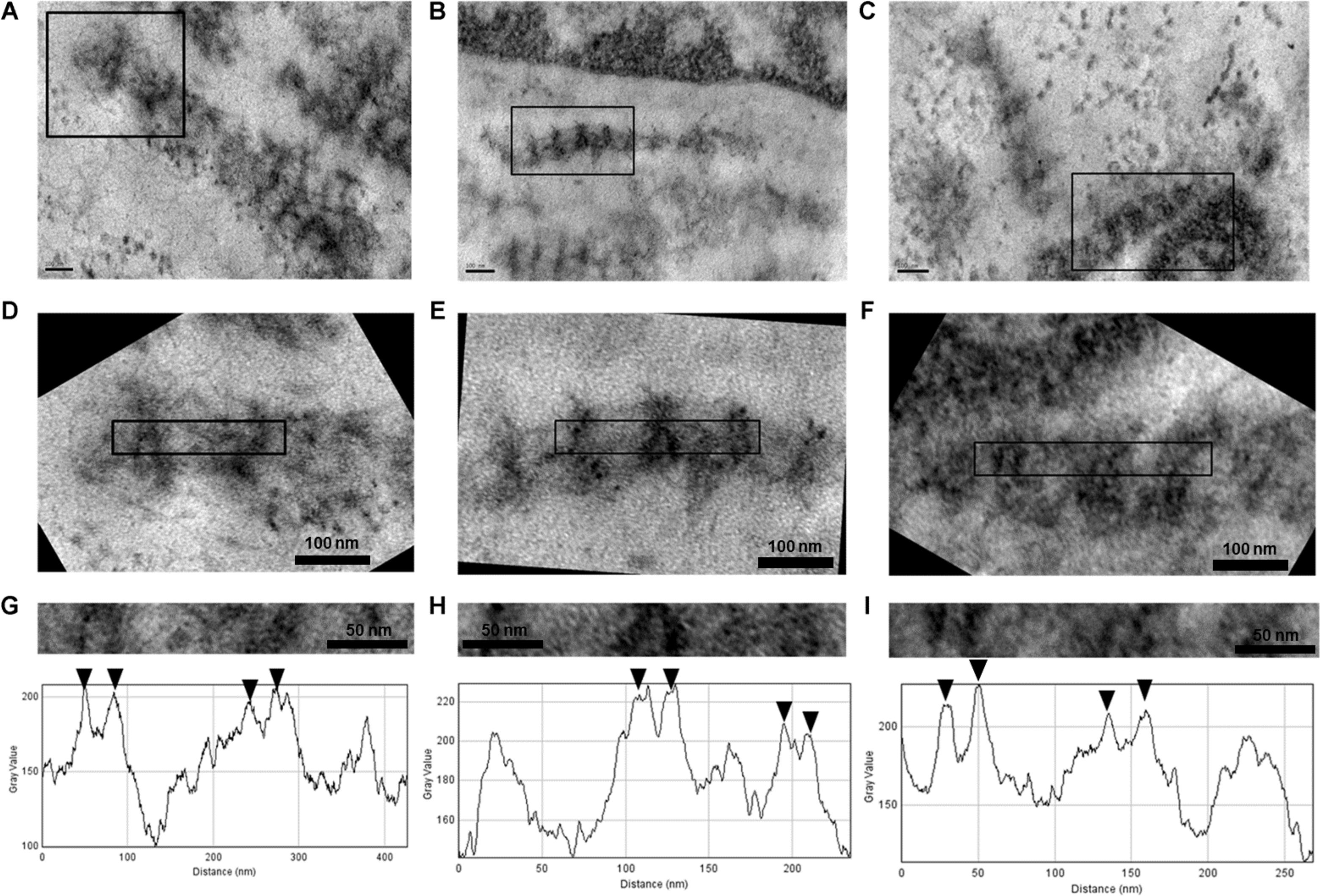 boxed regions in A, B, and C are magnified in D, E, and F (scale bars = 100 nm). G, H, and I: A magnified view and profile density plot of the boxed regions in D, E, and F (scale bars = 50 nm). The horizontal axis of the plots corresponds to distance along the long axis of the rectangular selections.