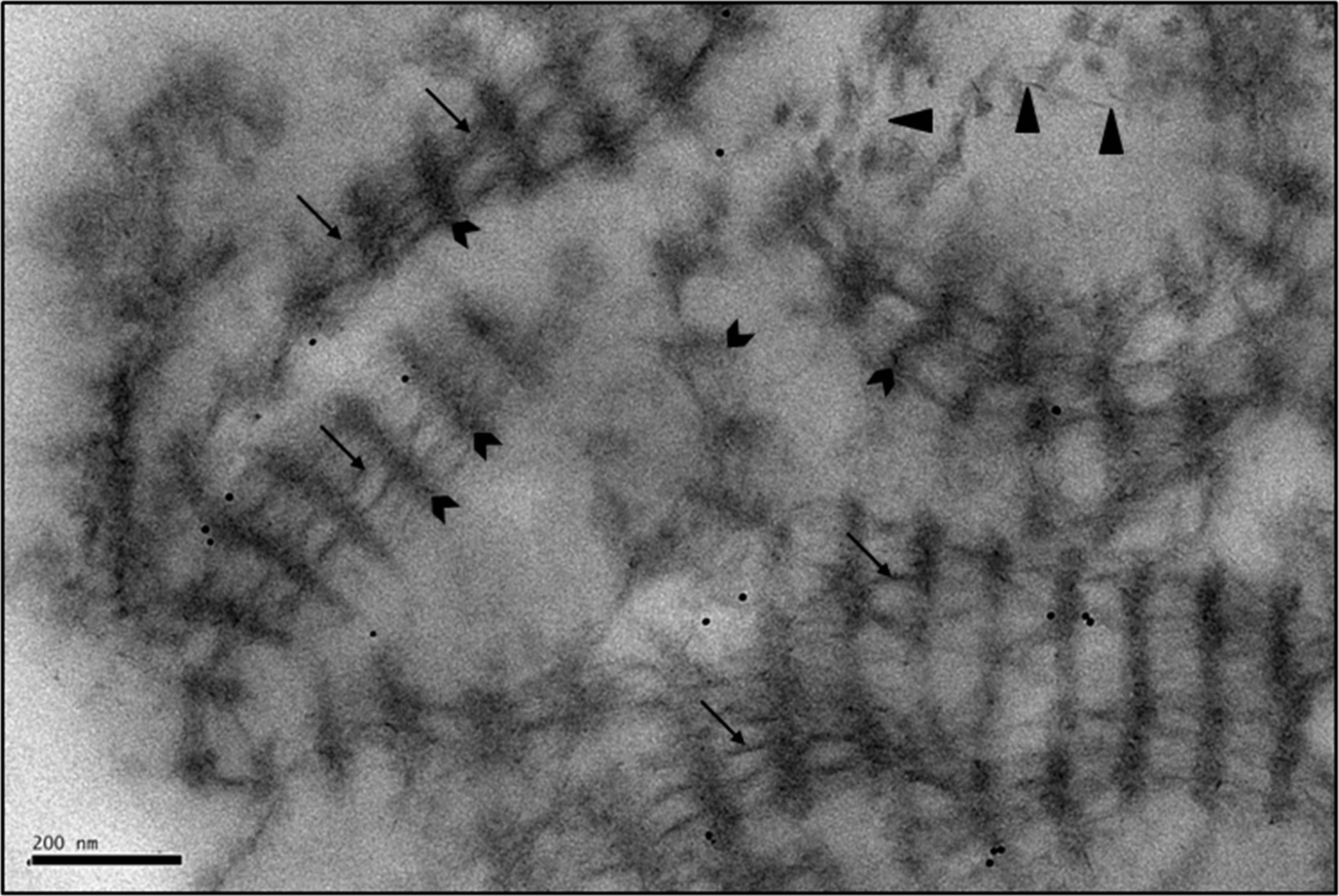(arrows) cross the transverse bands at different angles. Proteoglycans are also seen in the matrix (arrowheads). Several 10-nm
