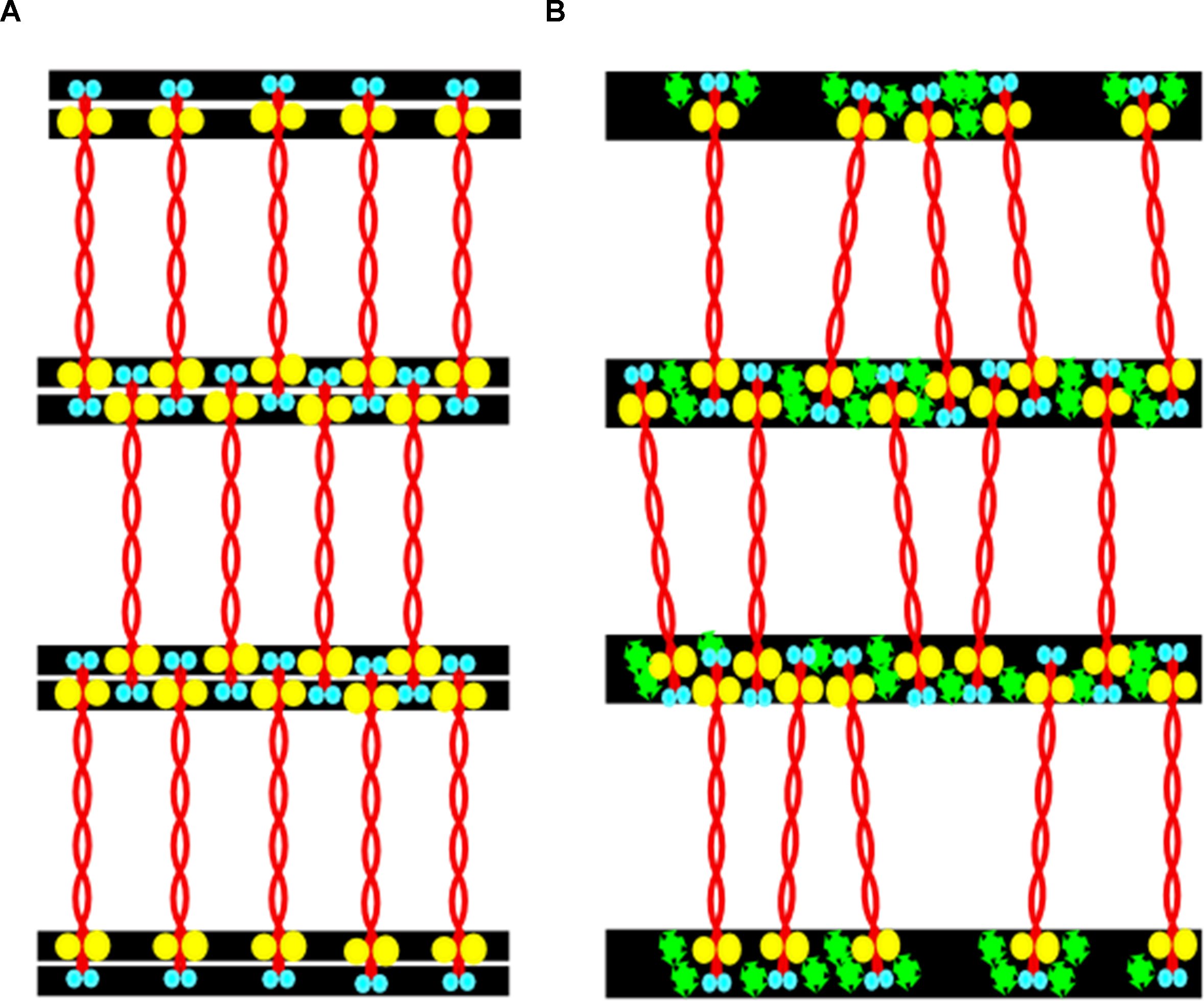 respectively, and the collagenous triple helices in red. A: Model for the double-banded aggregates arising from the alignment of the N- and C-globular domains of the collagen VI tetramers.