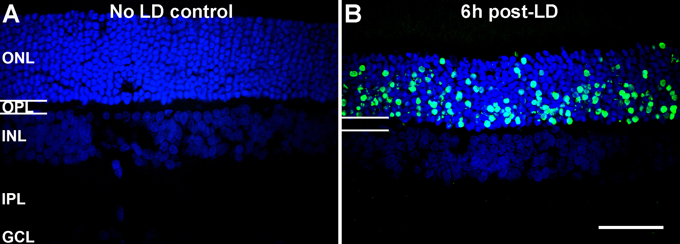 nuclei in the retina. In these images the ganglion cell layer (GCL) appears weakly labeled. A: Terminal deoxynucleotidyl transferase-mediated uridine 5′-triphosphate-biotin nick end labeling (TUNEL) labeling (green)