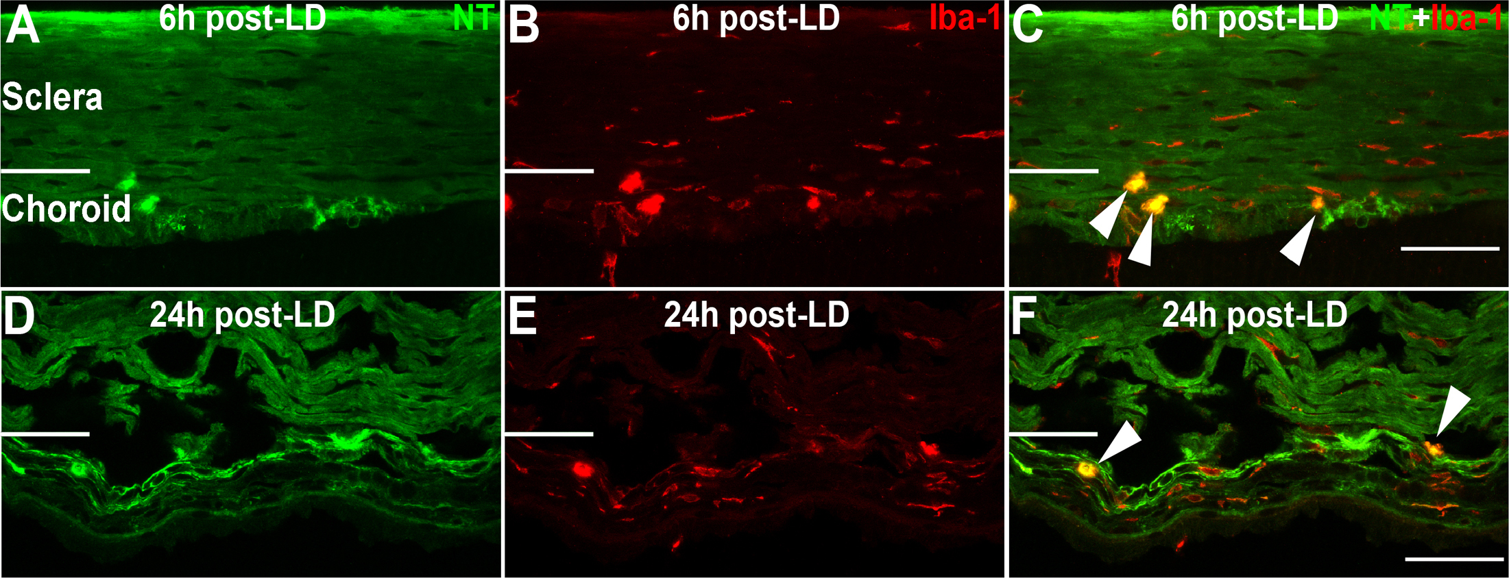 A–C: Immunolabeling for nitrotyrosine (A), ionized calcium-binding adaptor molecule-1 (Iba-1) (B), and combined images (C), seen here at 6 h post-injury. D–F: Immunolabeling for nitrotyrosine (D), Iba-1 (E), and combined images (F), seen here at 24 h post-injury. Nitrotyrosine was colocalized with Iba-1 expression on macrophages (arrow heads in C and F). Abbreviations: NT, nitrotyrosine; LD, light damage. Scale bar = 50 µm.