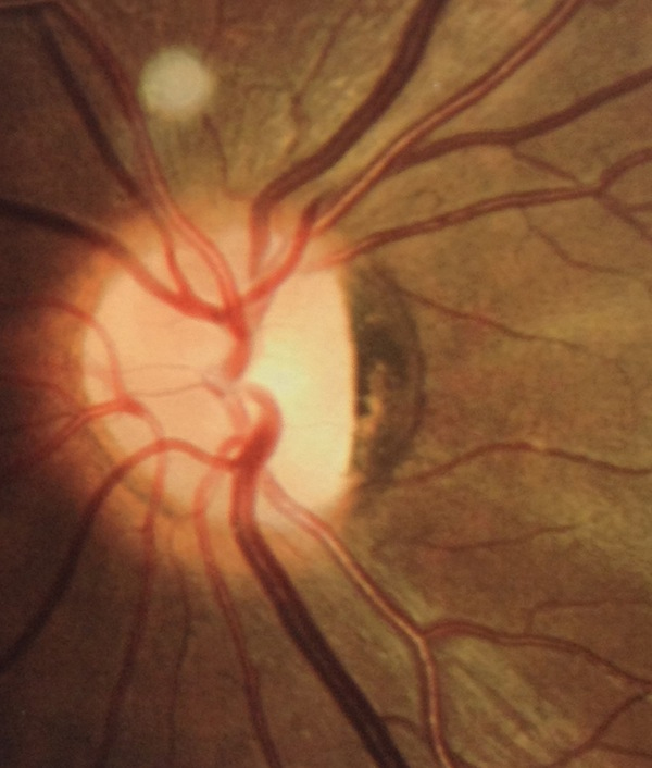 Fundus photograph of the left optic disc showing gray crescent situated temporally in patient F3 III:24.