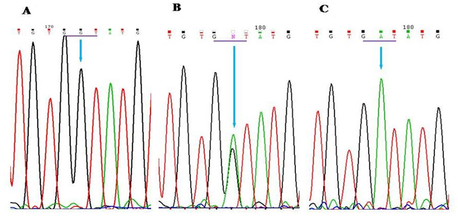 Figure 5. Chromatogram representing the p.Asp406Gly mutation in the NR2E3 gene. A: p.Asp406Gly mutation in the homozygous state. B: p.Asp406Gly mutation in the heterozygous state. C: Wild type. The underline marks the mutated codon. The arrow indicates the position of the mutation.