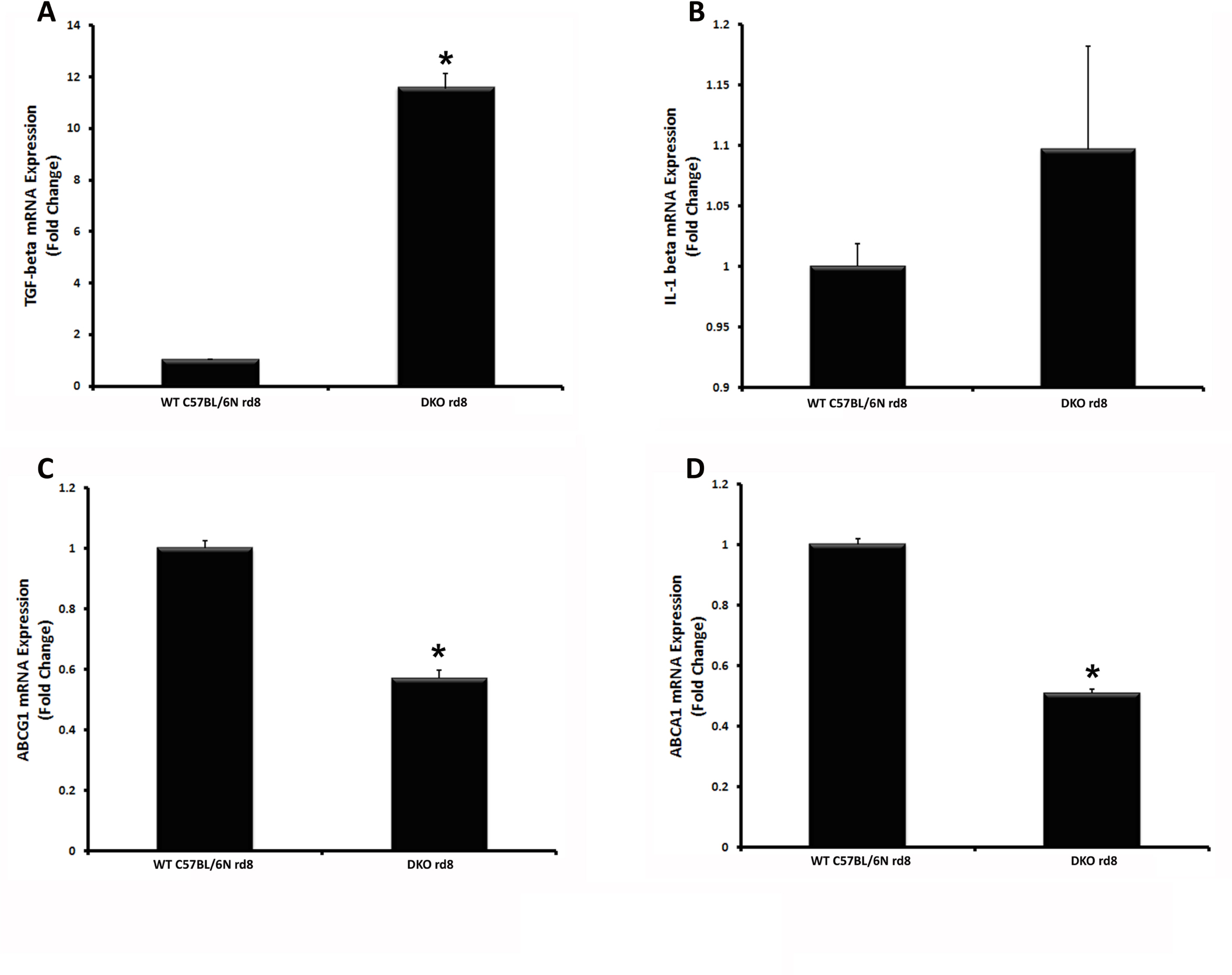 Figure 3. Expression of proinflammatory cytokines and cholesterol efflux pumps in the Ccl2−/−/Cx3cr1−/− double knockout mouse retina. Quantitative polymerase chain reaction (qPCR) analysis of (A) transforming growth factor-β (TGF-β), (B) interleukin-1β (IL-1β), (C) adenosine triphosphate-binding cassette sub-family G member 1 (ABCG1), and (D) adenosine triphosphate-binding cassette sub-family A member 1 (ABCA1) expression in the wild-type (WT) C57BL/6N rd8 and