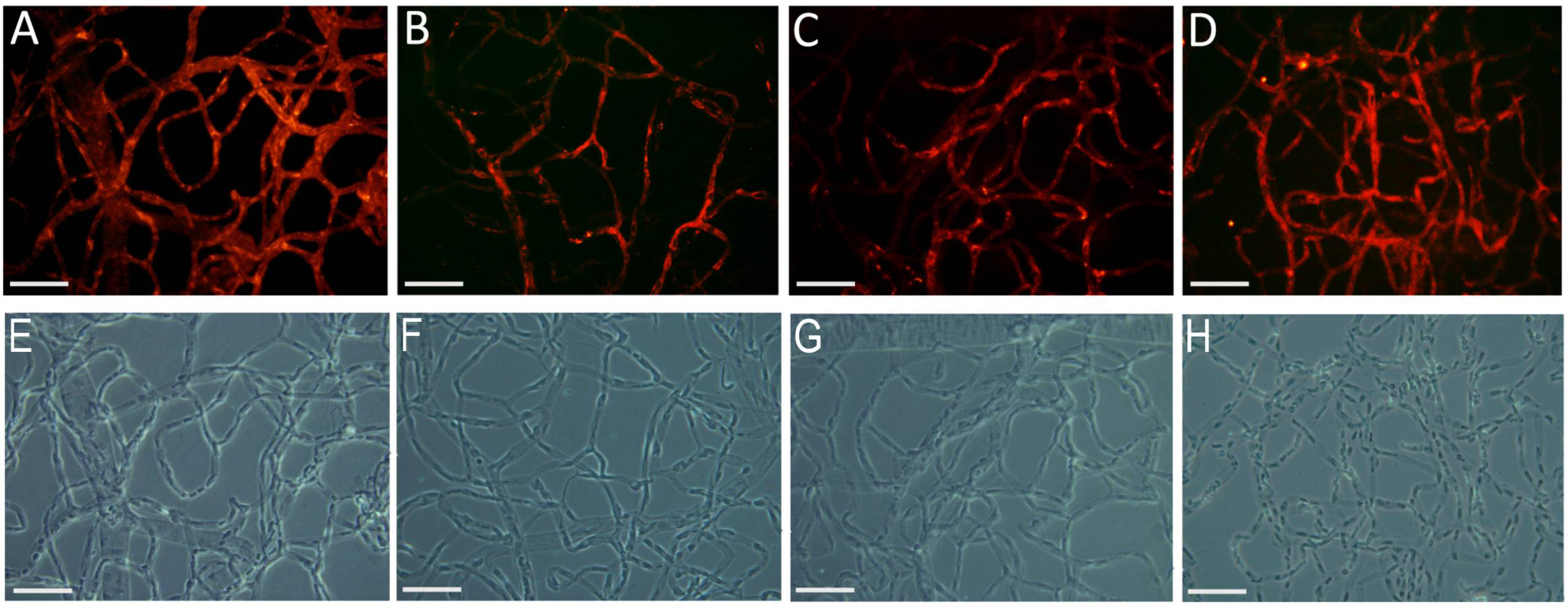 Figure 2. Cx43 immunostaining rat retinal capillaries. Representative images showing Cx43 immunostaining in the retinal vessels of (A) non-diabetic control rats, (B) diabetic rats, (C) non-diabetic rats intravitreally injected with Cx43 siRNA and (D) non-diabetic rats intravitreally injected with scrambled siRNA with corresponding bright-field images (E–H). Cx43 immunostaining was significantly reduced in the retinal vessels of diabetic rats and those of rats injected with Cx43