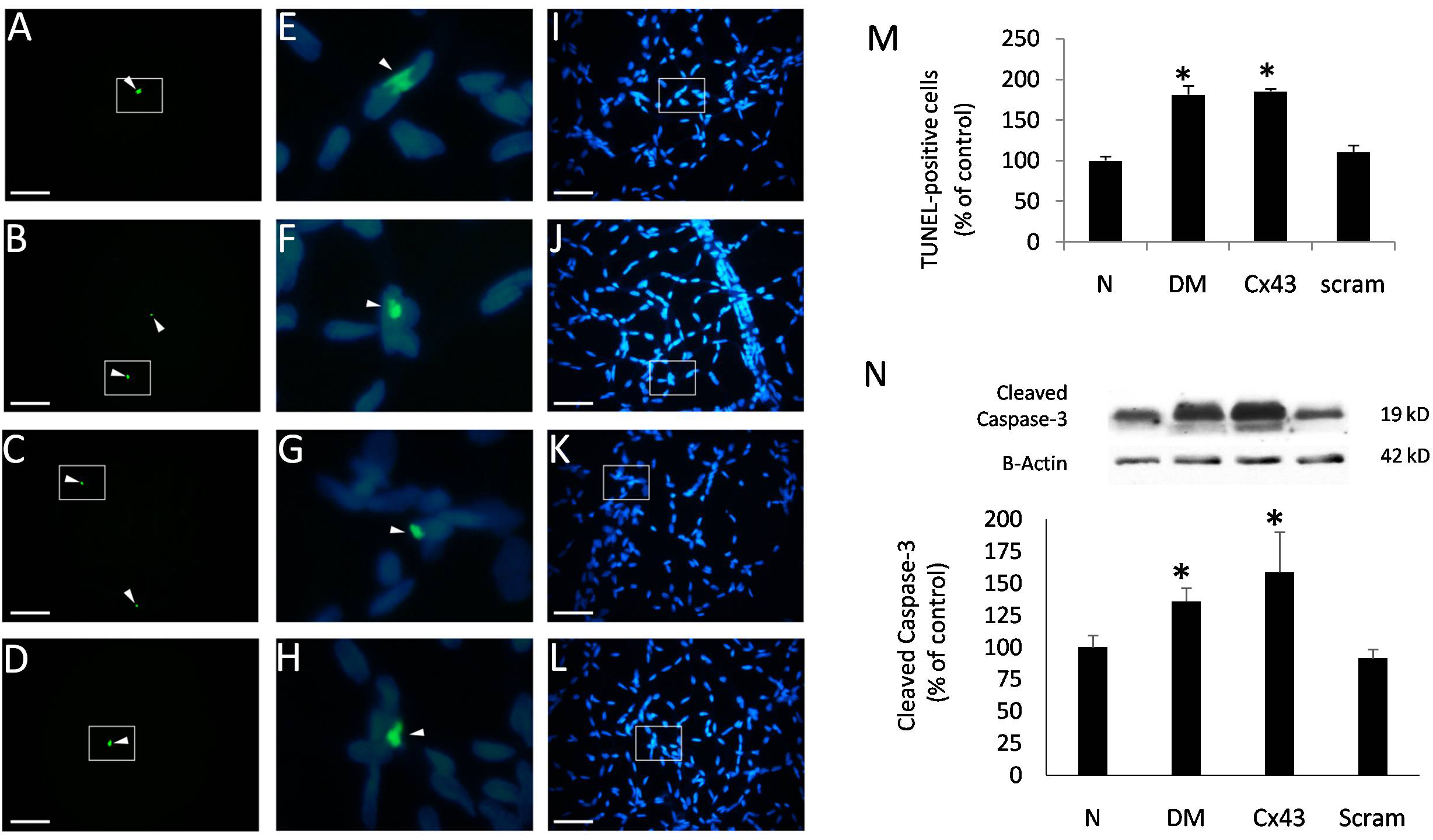 injected with Cx43 siRNA. N: Representative western blot (WB) showing expression of cleaved caspase-3 (upper) in the retinal tissue of normal rats, diabetic