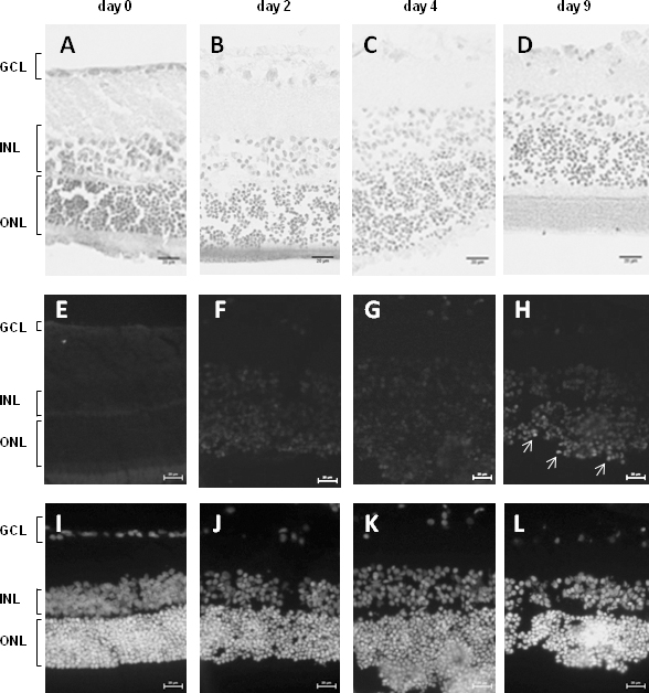 the ONL (white arrows). I–L: 4,6-diaminophenyl-indolamine (DAPI) staining of the sections analyzed with TUNEL assay in retinas sampled at day 0 (I), 2 (J), 4 (K), and 9 (L). GCL, ganglion cell layer; INL, inner nuclear layer; ONL, outer nuclear layer. Scale bars = 20 µm.