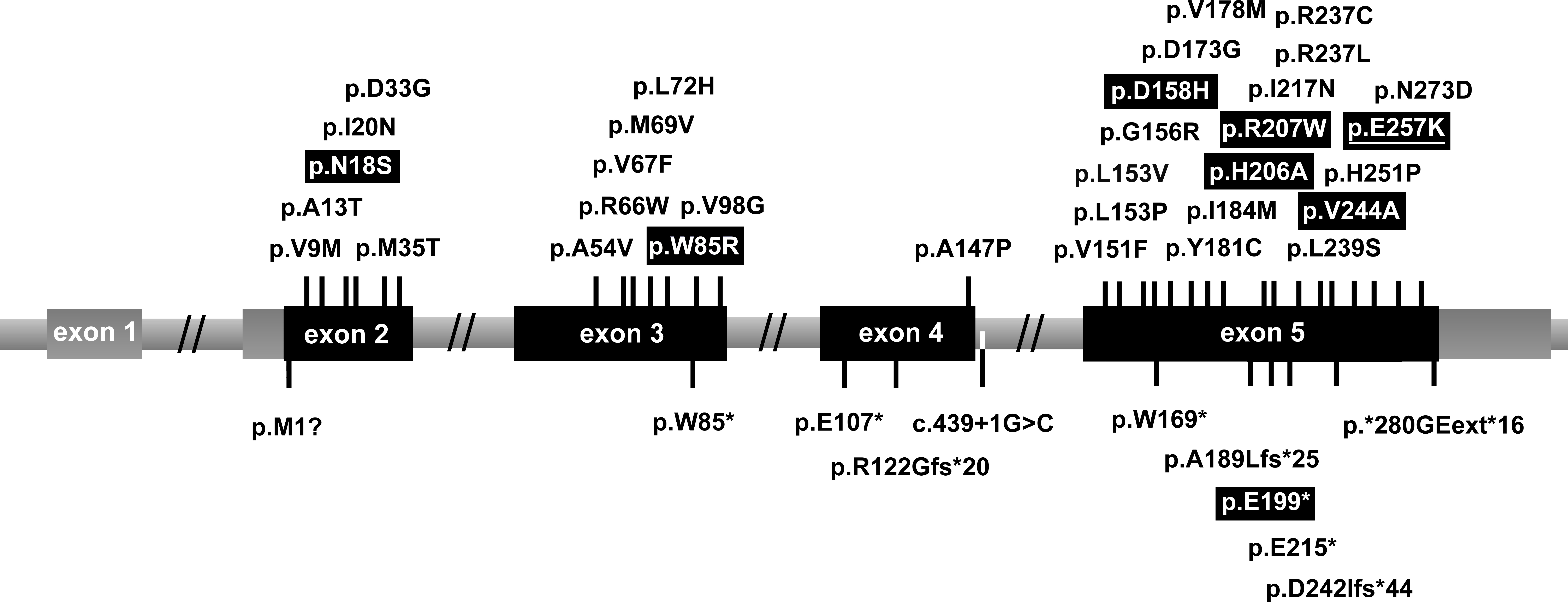 Variants identified in this study are indicated by white letters in black boxes. The most common mutation, p.E257K, is underlined.