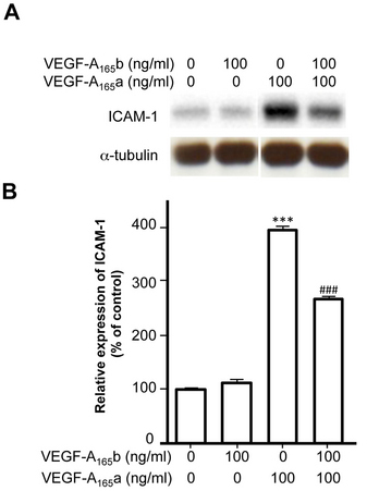 Figure 3. VEGF-A165b inhibited VEGF-A165a-ICAM-1 expression. A: Immunoblot for ICAM 1 expression in primary RPE cells. B: Relative expression of the intercellular adhesion molecule-1 (ICAM-1) protein. ICAM-1 was normalized with α-tubulin (as