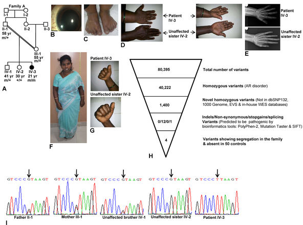 at the same magnification. F: Short stature. G: The absence of stiffness of joints in the patient and her unaffected sister is shown by the ability to make fists. H: Whole exome sequencing (WES) data. I: Sequencing chromatograms of individuals from family A. Arrows mark the nucleotide change G>T. + and m represent the wild-type