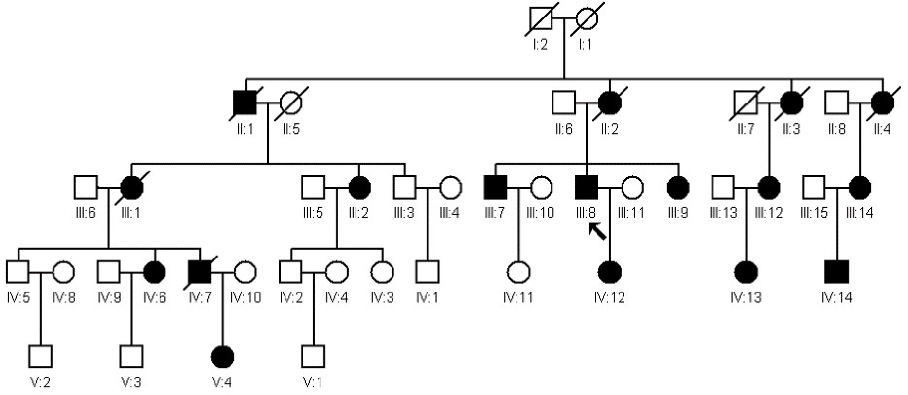 Figure 1. Pedigree of the extended family. Squares and circles indicate men and women, respectively. The solid symbols represent affected