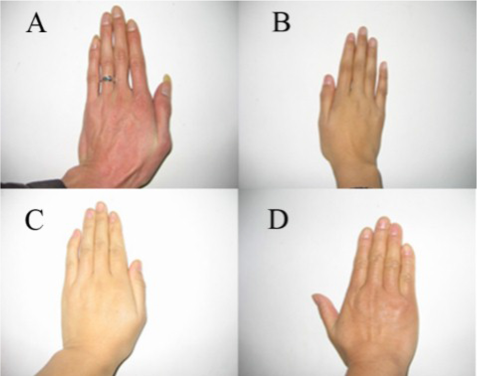 Figure 3. Photos of the patients’ hands. The long fingers of affected subjects are shown in A and B. A: Patient IV:7’s hand (adult) is 20.4 cm long. B: Patient V:4’s hand (12 years old) is 17.5 cm long. Family members’ hands that are normal length are shown in C and D. C: Patient IV:3’s hand (adult) is 17.5 cm long. D: Patient IV:2’s hand (adult) is 17 cm long.