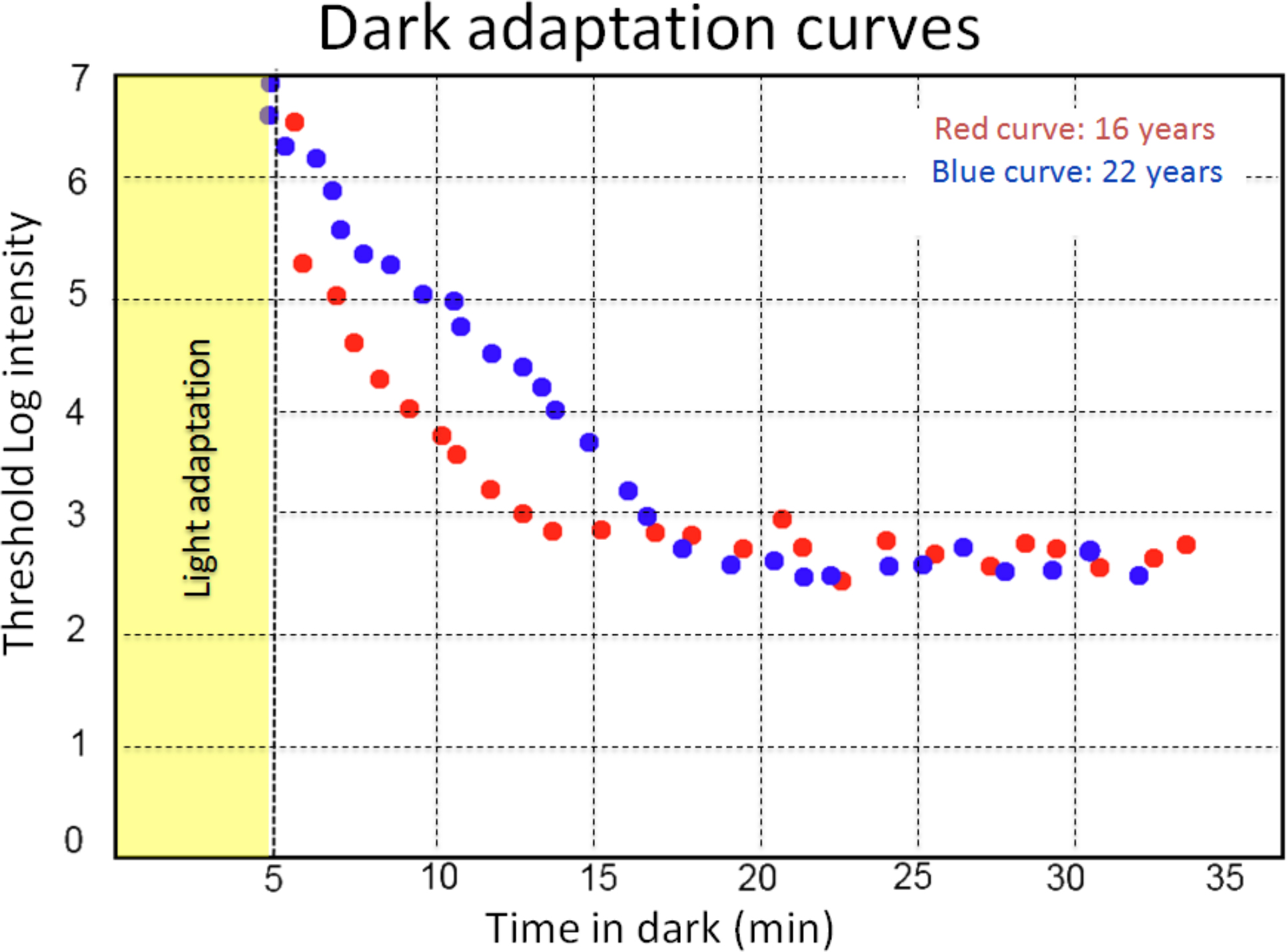 This delay occurs about 10 min after the dark adaptation and lasts for about 7 min. Furthermore, at age 16, the dark adaptation