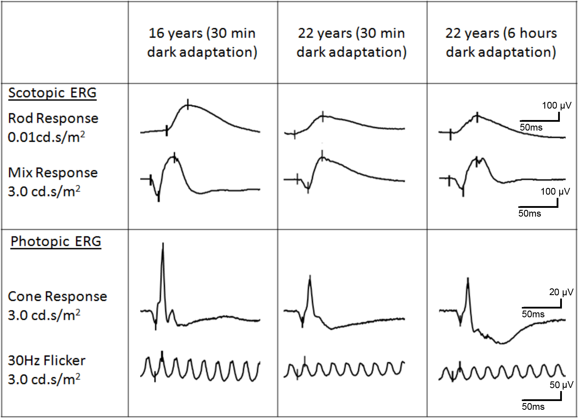 2=candela seconds per square meter. µV=microvolts. ms=milliseconds.