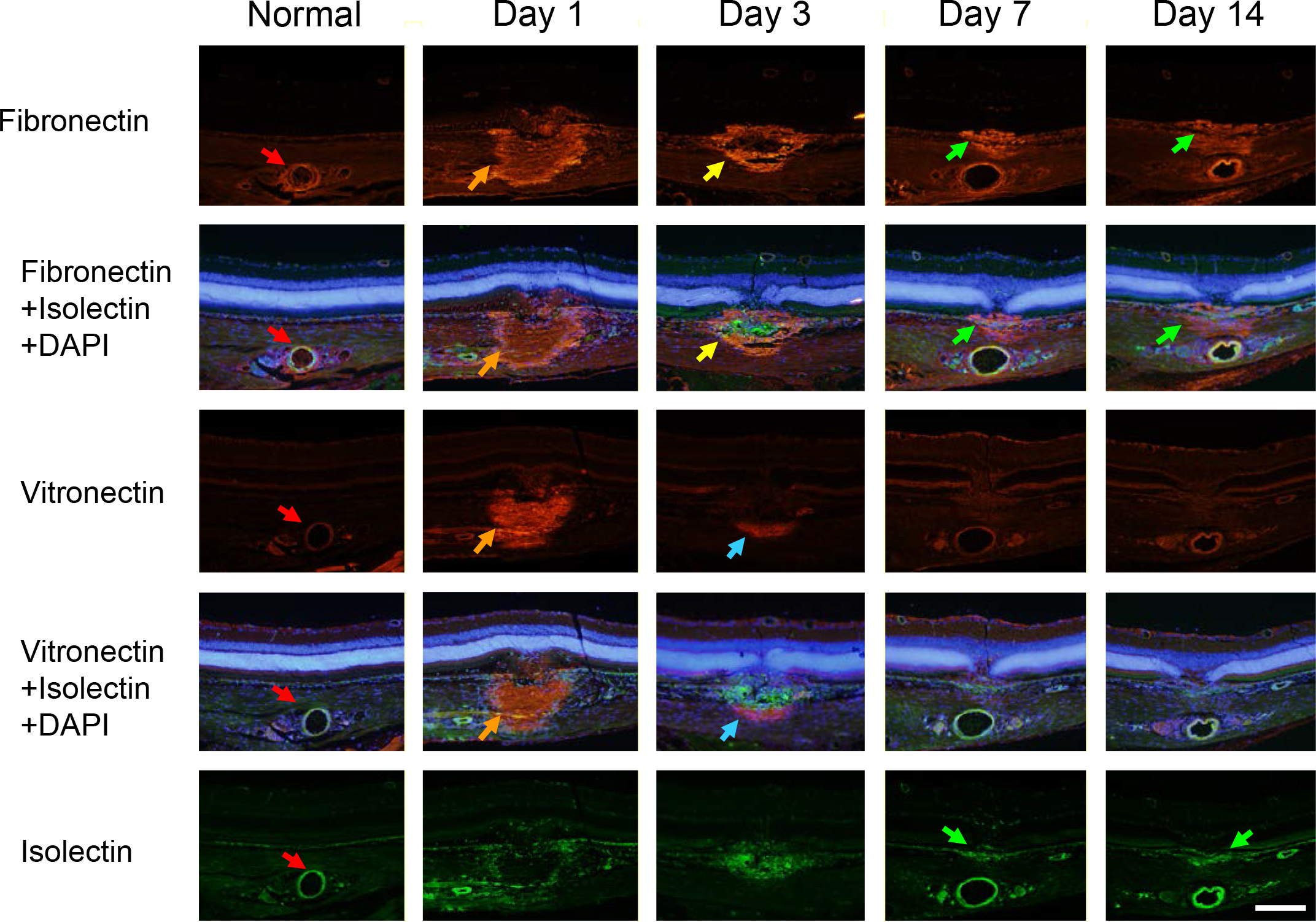 arrows indicate the antibody binding for FN and VN between the subretinal space and sclera after laser treatment. The yellow