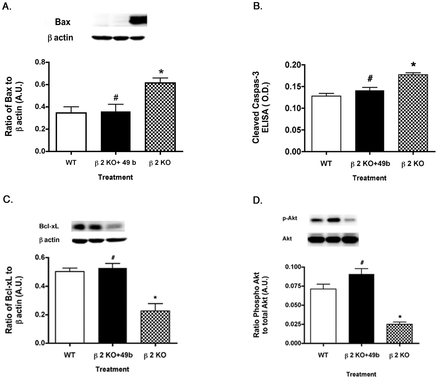 Figure 4. Pro- and anti-apoptotic proteins in control, β2KO+49b and β2KO lysates. Proapoptotic (Panels A–B) and antiapoptotic (Panels C–D) in control, β2-adrenergic receptor knockout mice+49b, and β2-adrenergic receptor knockout mice. A–D: Compound 49b reduces proapoptotic protein levels of Bax (A) and cleaved caspase 3 (B), while increasing the antiapoptotic proteins Bcl-xL (C) and phosphorylated Akt (D). *p<0.05 versus wild-type (WT); #p<0.05 versus β2-adrenergic receptor knockout (KO) mice. n = 5 for all groups. Data are