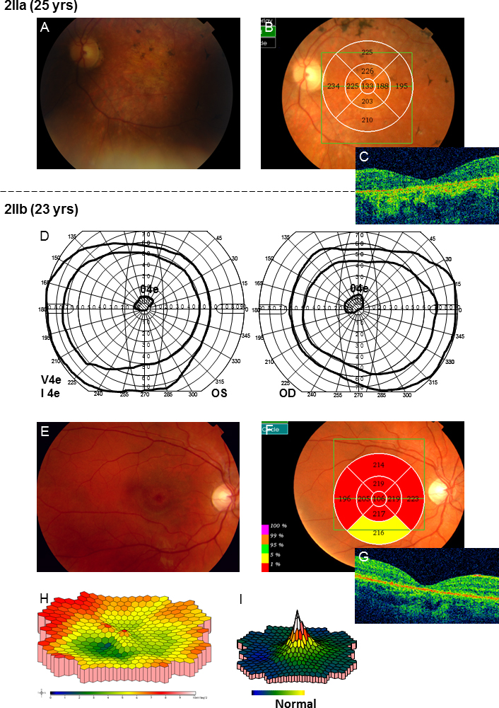 D: Goldmann visual field plots for patient 2IIb showed normal outer borders for the V4e and I4e but small scotomas for the