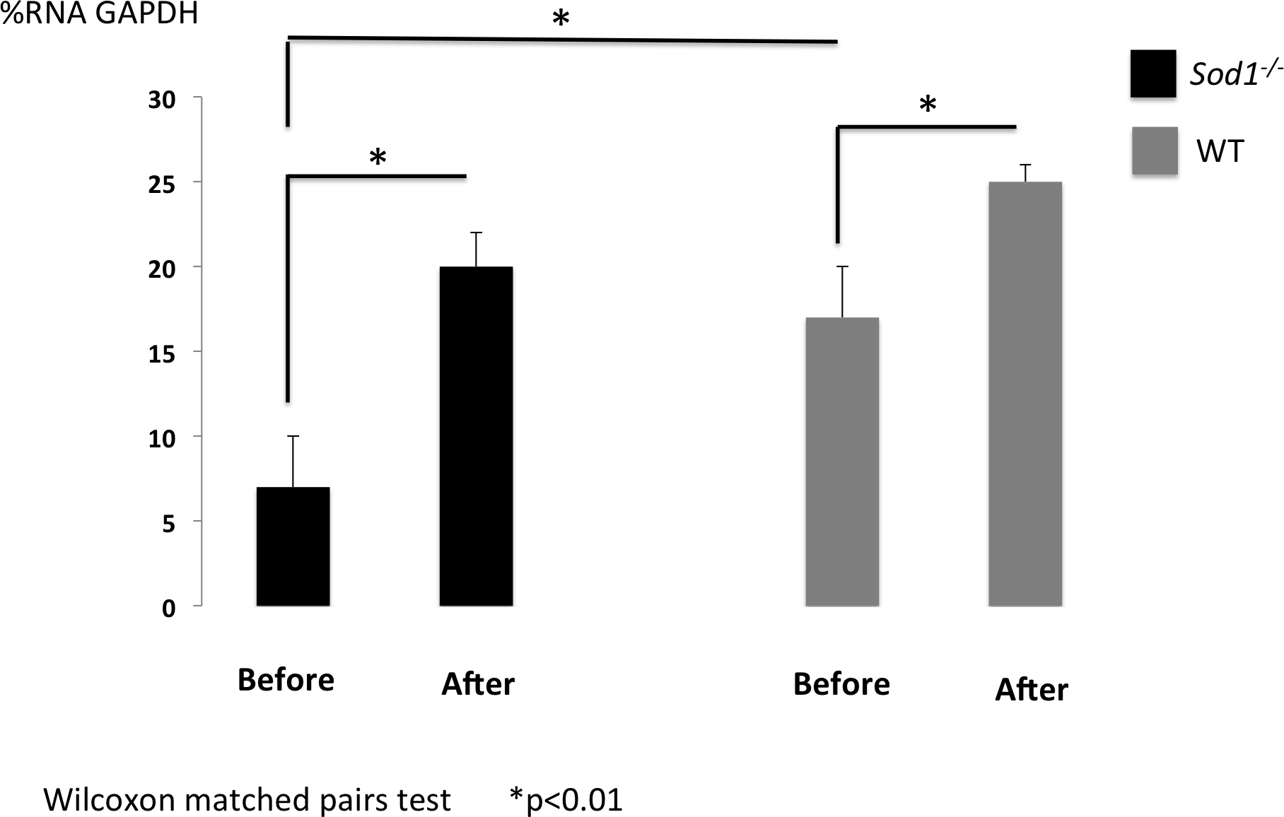 application in the Sod1-/- mice and wild type (WT) mice. Note the significant increase in muc 5Ac mRNA expression in both WT and the Sod1-/- mice with 2 weeks of diquafosol sodium treatment. * represents p < 0.01.