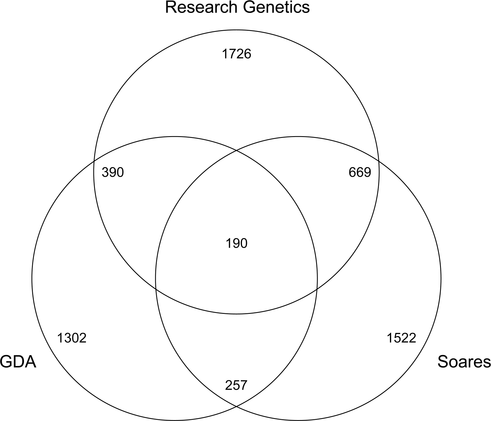 Figure 3. A non-proportional Venn diagram describing overlap of genes identified by each of the three experiments. “Research Genetics”