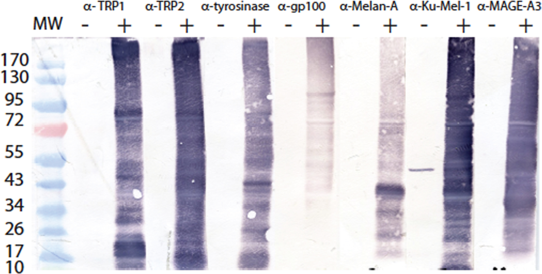 Figure 2. (-): bacterial extracts from induced culture of bacteria containing the empty vector pKE-1. (+): bacterial extracts from